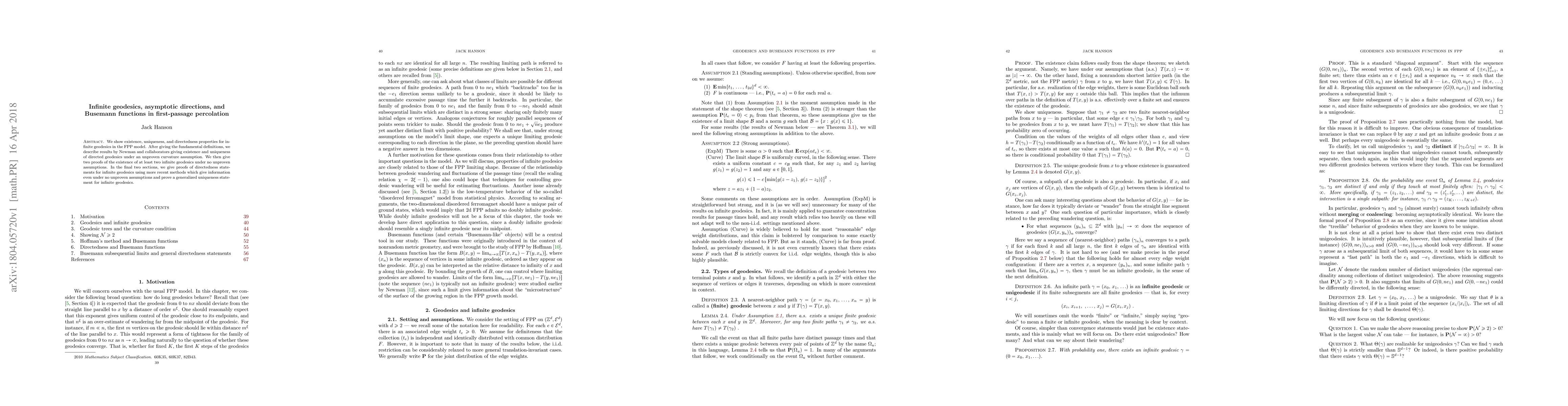 We show existence, uniqueness, and directedness properties for infinite geodesics in the FPP model. After giving the fundamental definitions, we describe results by Newman and collaborators giving existence and uniqueness of directed geodesics under an unproven curvature assumption. We then give two proofs of the existence of at least two infinite geodesics under no unproven assumptions. In the final two sections, we give proofs of directedness statements for infinite geodesics using more recent methods which give information even under no unproven assumptions and prove a generalized uniqueness statement for infinite geodesics.