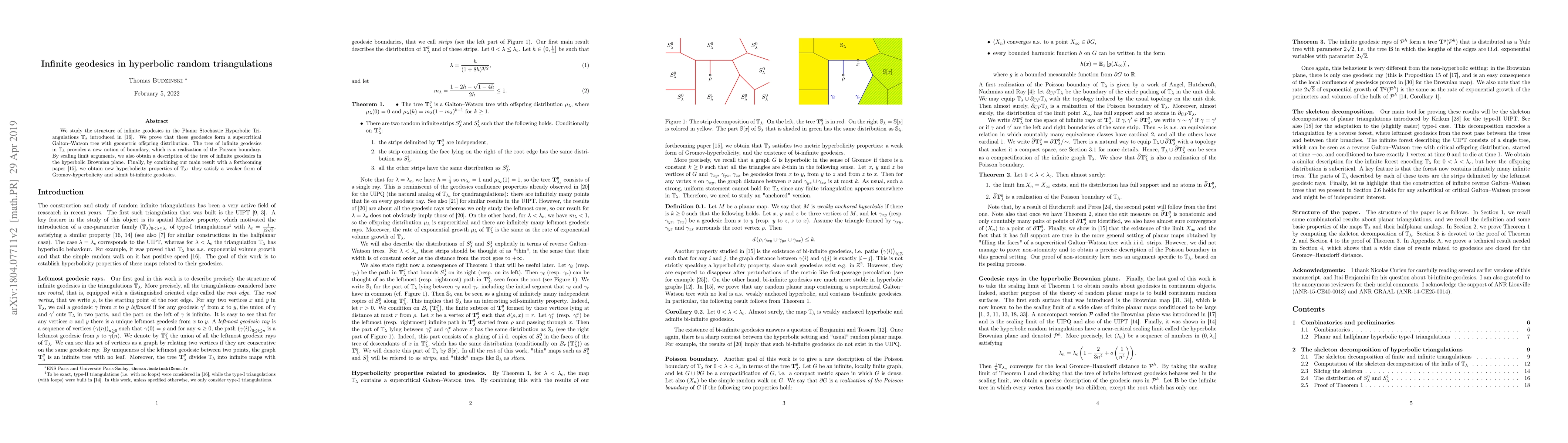 This paper investigates infinite geodesics in hyperbolic random triangulations, proving they form a supercritical Galton-Watson tree with geometric offspring distribution, and introduces a new notion of boundary realized as the Poisson boundary. It also provides insights into the hyperbolic Brownian plane through scaling limits.