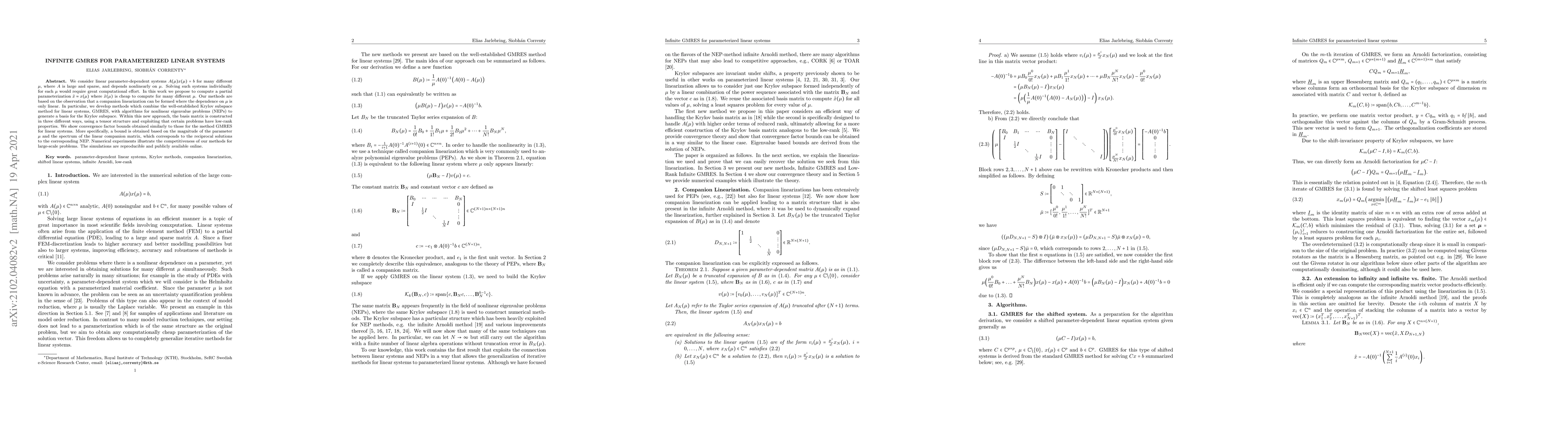 We consider linear parameter-dependent systems $A(\mu) x(\mu) = b$ for many different $\mu$, where $A$ is large and sparse, and depends nonlinearly on $\mu$. Solving such systems individually for each $\mu$ would require great computational effort. In this work we propose to compute a partial parameterization $\tilde{x} \approx x(\mu)$ where $\tilde{x}(\mu)$ is cheap to compute for many different $\mu$. Our methods are based on the observation that a companion linearization can be formed where the dependence on $\mu$ is only linear. In particular, we develop methods which combine the well-established Krylov subspace method for linear systems, GMRES, with algorithms for nonlinear eigenvalue problems (NEPs) to generate a basis for the Krylov subspace. Within this new approach, the basis matrix is constructed in three different ways, using a tensor structure and exploiting that certain problems have low-rank properties. We show convergence factor bounds obtained similarly to those for the method GMRES for linear systems. More specifically, a bound is obtained based on the magnitude of the parameter $\mu$ and the spectrum of the linear companion matrix, which corresponds to the reciprocal solutions to the corresponding NEP. Numerical experiments illustrate the competitiveness of our methods for large-scale problems. The simulations are reproducible and publicly available online.