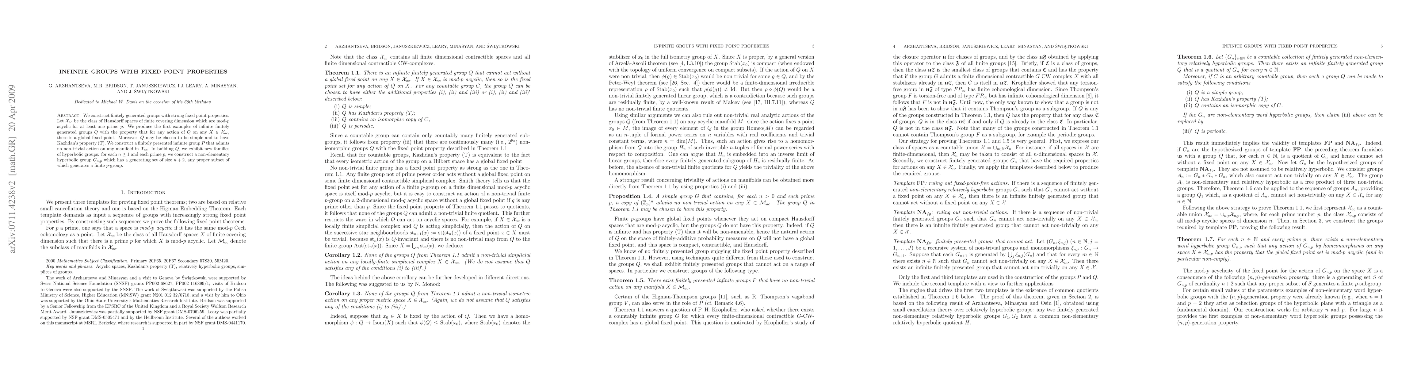 We construct finitely generated groups with strong fixed point properties. Let $\mathcal{X}_{ac}$ be the class of Hausdorff spaces of finite covering dimension which are mod-$p$ acyclic for at least one prime $p$. We produce the first examples of infinite finitely generated groups $Q$ with the property that for any action of $Q$ on any $X\in \mathcal{X}_{ac}$, there is a global fixed point. Moreover, $Q$ may be chosen to be simple and to have Kazhdan's property (T). We construct a finitely presented infinite group $P$ that admits no non-trivial action by diffeomorphisms on any smooth manifold in $\mathcal{X}_{ac}$. In building $Q$, we exhibit new families of hyperbolic groups: for each $n\geq 1$ and each prime $p$, we construct a non-elementary hyperbolic group $G_{n,p}$ which has a generating set of size $n+2$, any proper subset of which generates a finite $p$-group.