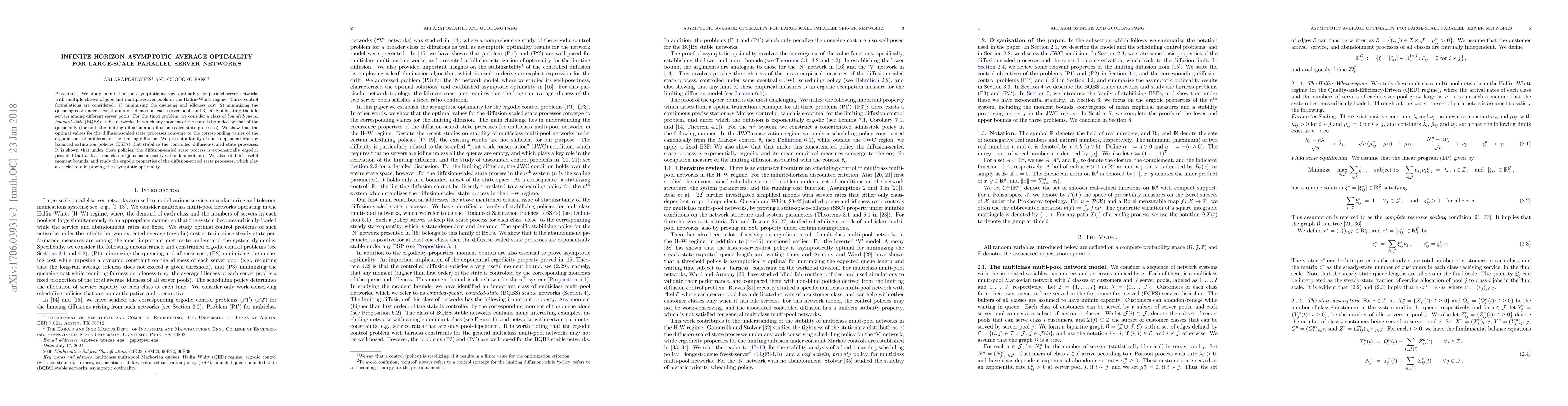 This paper investigates infinite-horizon asymptotic average optimality in large-scale parallel server networks under the Halfin-Whitt regime, focusing on three control formulations. It demonstrates the convergence of optimal values for diffusion-scaled state processes and presents state-dependent Markov balanced saturation policies that ensure exponential ergodicity and asymptotic optimality.