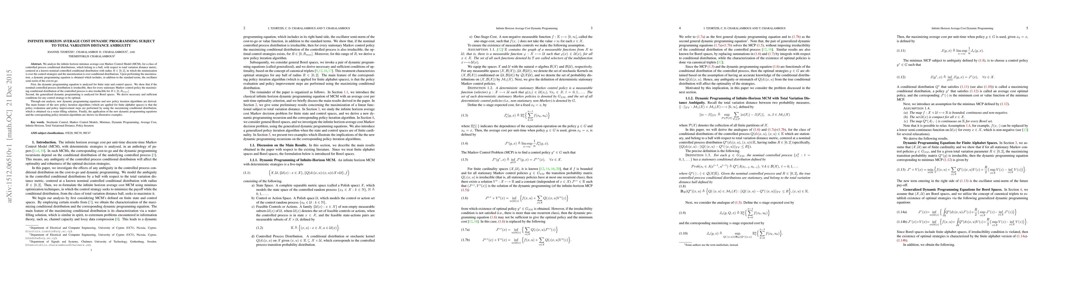 We analyze the infinite horizon minimax average cost Markov Control Model (MCM), for a class of controlled process conditional distributions, which belong to a ball, with respect to total variation distance metric, centered at a known nominal controlled conditional distribution with radius $R\in [0,2]$, in which the minimization is over the control strategies and the maximization is over conditional distributions. Upon performing the maximization, a dynamic programming equation is obtained which includes, in addition to the standard terms, the oscillator semi-norm of the cost-to-go. First, the dynamic programming equation is analyzed for finite state and control spaces. We show that if the nominal controlled process distribution is irreducible, then for every stationary Markov control policy the maximizing conditional distribution of the controlled process is also irreducible for $R \in [0,R_{max}]$. Second, the generalized dynamic programming is analyzed for Borel spaces. We derive necessary and sufficient conditions for any control strategy to be optimal. Through our analysis, new dynamic programming equations and new policy iteration algorithms are derived. The main feature of the new policy iteration algorithms (which are applied for finite alphabet spaces) is that the policy evaluation and policy improvement steps are performed by using the maximizing conditional distribution, which is obtained via a water filling solution. Finally, the application of the new dynamic programming equations and the corresponding policy iteration algorithms are shown via illustrative examples.