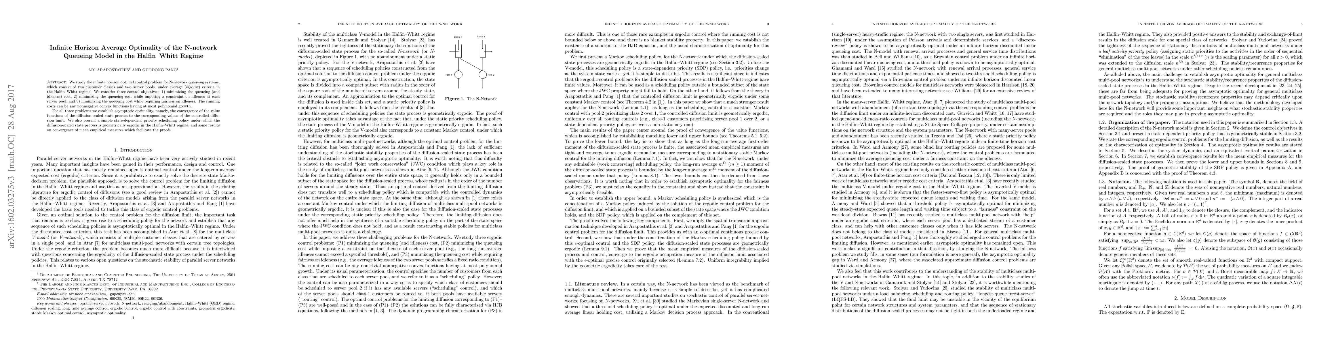 This paper investigates the infinite horizon optimal control of N-network queueing systems under average criteria in the Halfin-Whitt regime, focusing on minimizing queueing costs with constraints on idleness and fairness. It establishes asymptotic optimality and proposes a state-dependent priority scheduling policy ensuring geometric ergodicity.