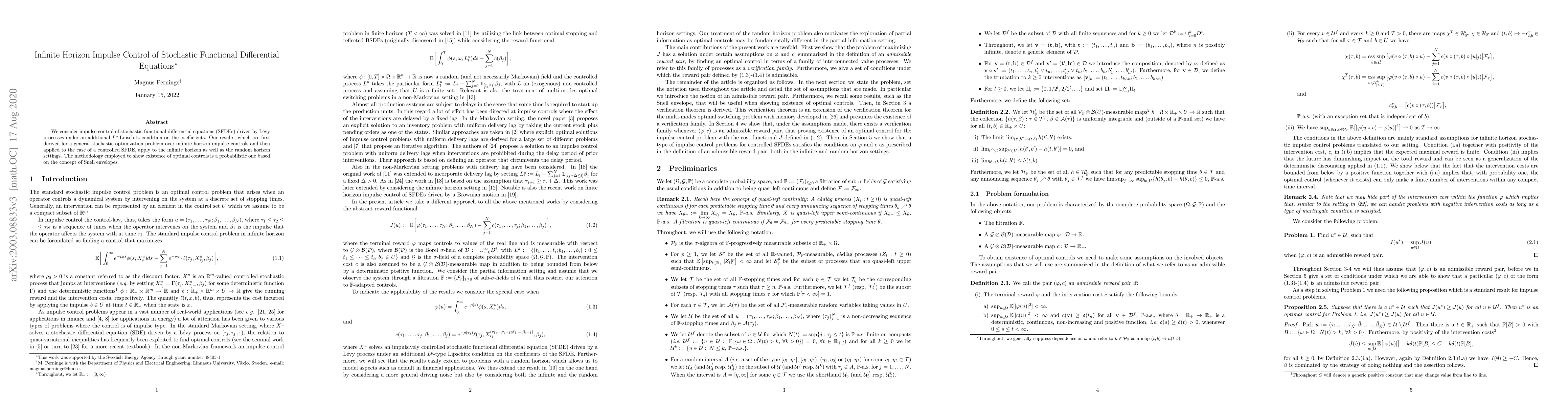 We consider impulse control of stochastic functional differential equations (SFDEs) driven by L\'evy processes under an additional $L^p$-Lipschitz condition on the coefficients. Our results, which are first derived for a general stochastic optimization problem over infinite horizon impulse controls and then applied to the case of a controlled SFDE, apply to the infinite horizon as well as the random horizon settings. The methodology employed to show existence of optimal controls is a probabilistic one based on the concept of Snell envelopes.