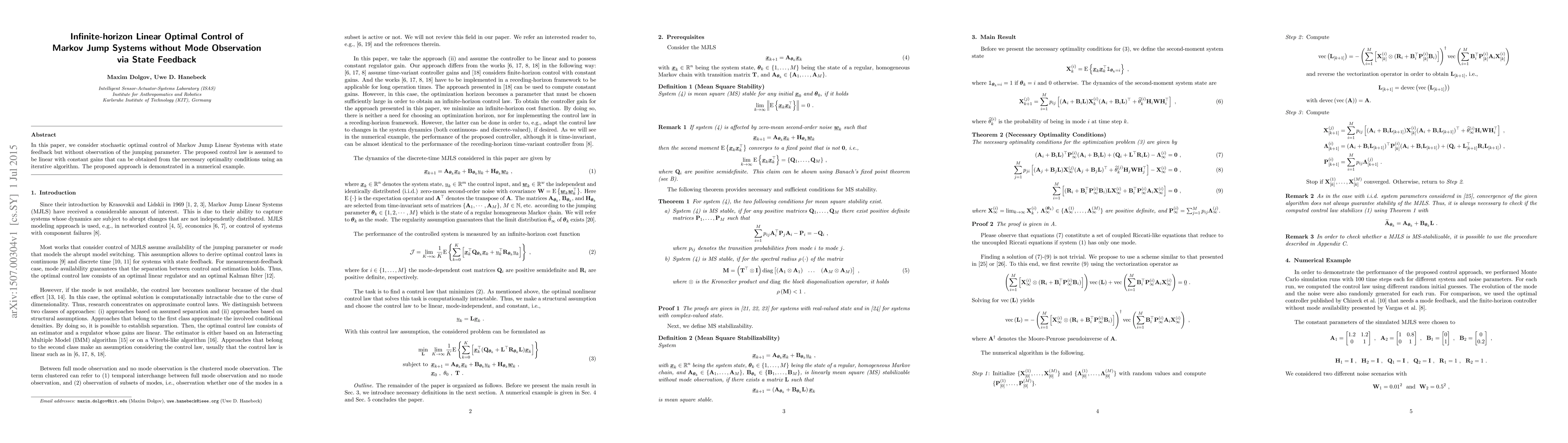 In this paper, we consider stochastic optimal control of Markov Jump Linear Systems with state feedback but without observation of the jumping parameter. The proposed control law is assumed to be linear with constant gains that can be obtained from the necessary optimality conditions using an iterative algorithm. The proposed approach is demonstrated in a numerical example.