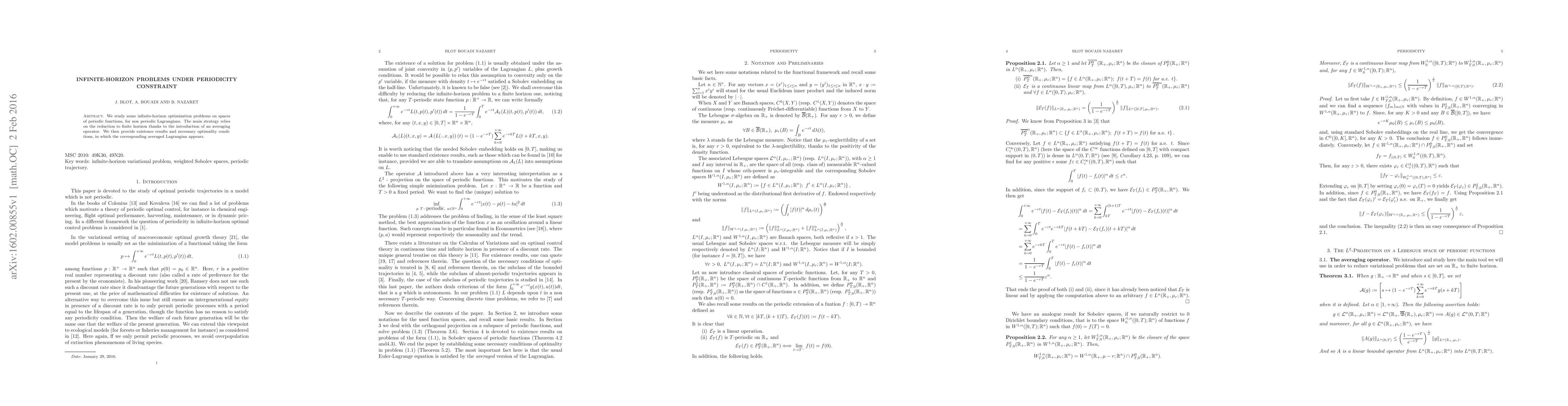 The paper studies infinite-horizon optimization problems on spaces of periodic functions for non-periodic Lagrangians, reducing the problem to finite horizon using an averaging operator and providing existence results and necessary optimality conditions.