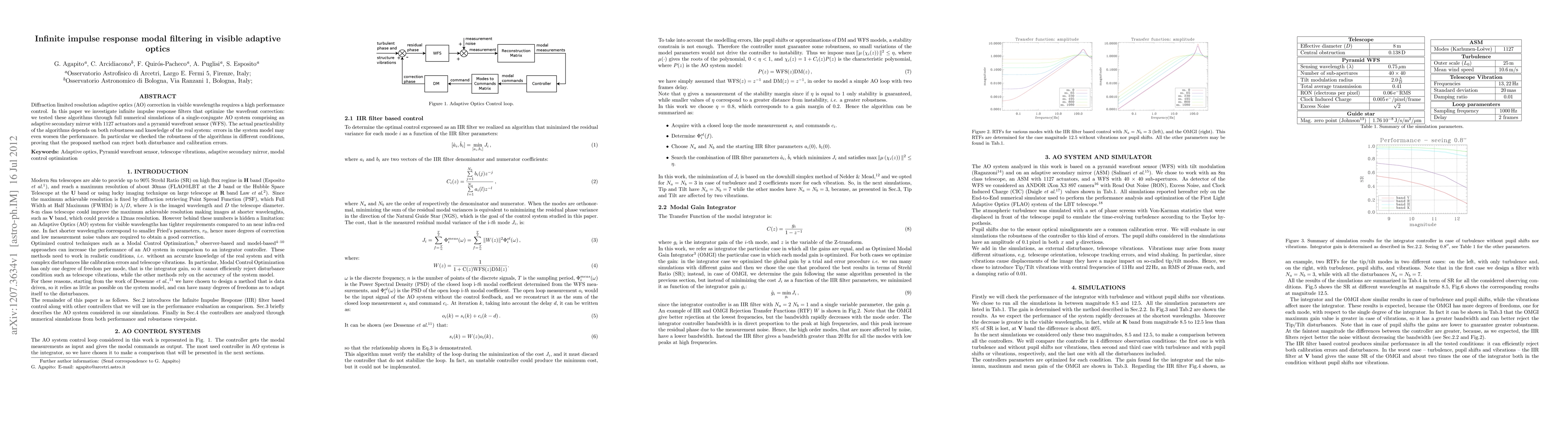 This paper explores infinite impulse response filters for optimizing wavefront correction in visible wavelength adaptive optics systems. Through numerical simulations of a single-conjugate AO setup, the authors demonstrate the robustness of the proposed method against disturbances and calibration errors, highlighting its practical applicability despite potential system model inaccuracies.