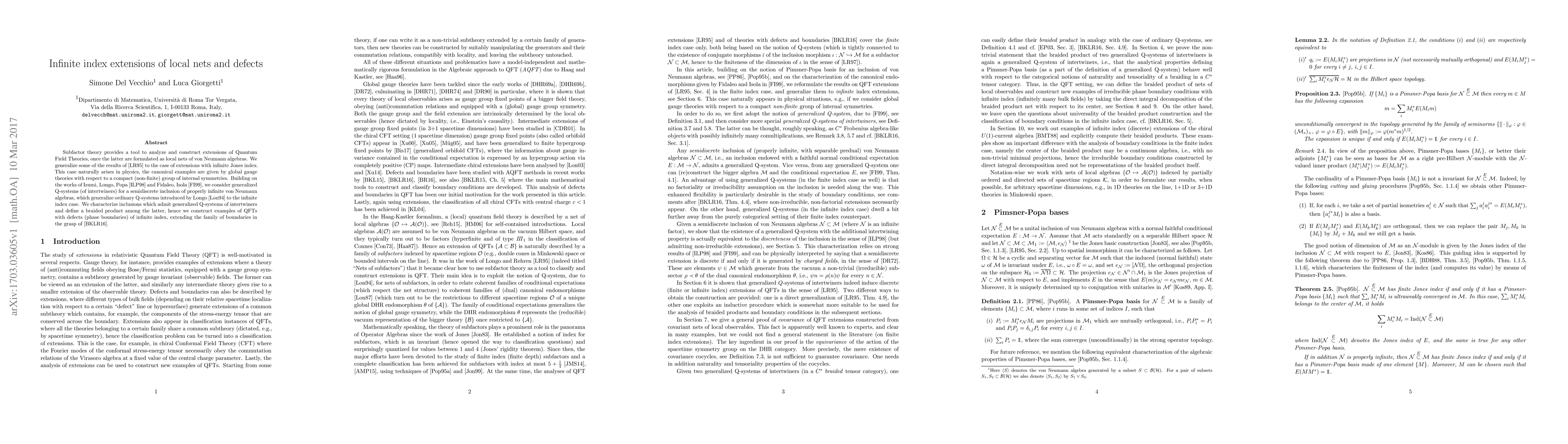 This paper generalizes subfactor theory results to infinite index extensions of local nets in Quantum Field Theories, focusing on global gauge theories with non-finite symmetry groups. It introduces generalized Q-systems for semidiscrete inclusions and constructs QFTs with defects of infinite index.