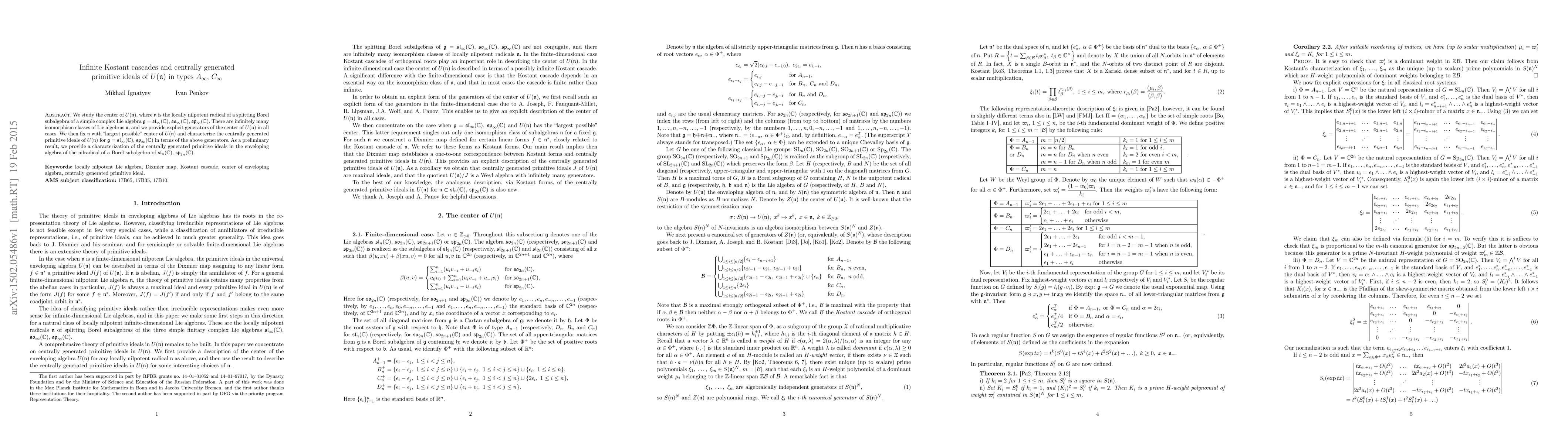 We study the center of $U(\mathfrak{n})$, where $\mathfrak{n}$ is the locally nilpotent radical of a splitting Borel subalgebra of a simple complex Lie algebra $\mathfrak{g}=\mathfrak{sl}_{\infty}(\mathbb{C})$, $\mathfrak{so}_{\infty}(\mathbb{C})$, $\mathfrak{sp}_{\infty}(\mathbb{C})$. There are infinitely many isomorphism classes of Lie algebras $\mathfrak{n}$, and we provide explicit generators of the center of $U(\mathfrak{n})$ in all cases. We then fix $\mathfrak{n}$ with "largest possible" center of $U(\mathfrak{n})$ and characterize the centrally generated primitive ideals of $U(\mathfrak{n})$ for $\mathfrak{g}=\mathfrak{sl}_{\infty}(\mathbb{C})$, $\mathfrak{sp}_{\infty}(\mathbb{C})$ in terms of the above generators. As a preliminary result, we provide a characterization of the centrally generated primitive ideals in the enveloping algebra of the nilradical of a Borel subalgebra of $\mathfrak{sl}_n(\mathbb{C})$, $\mathfrak{sp}_{2n}(\mathbb{C})$.