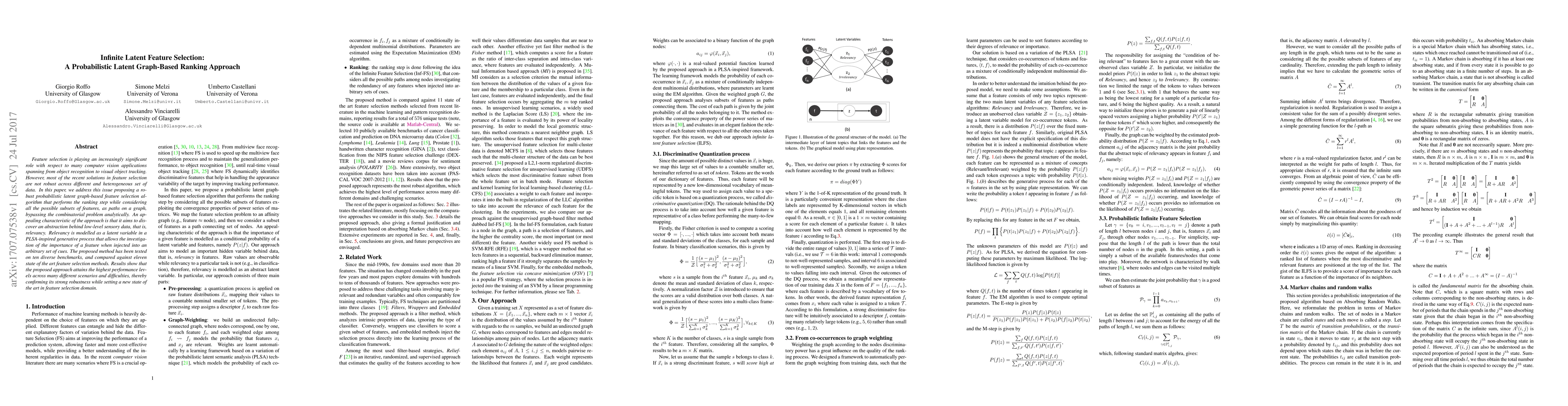 Feature selection is playing an increasingly significant role with respect to many computer vision applications spanning from object recognition to visual object tracking. However, most of the recent solutions in feature selection are not robust across different and heterogeneous set of data. In this paper, we address this issue proposing a robust probabilistic latent graph-based feature selection algorithm that performs the ranking step while considering all the possible subsets of features, as paths on a graph, bypassing the combinatorial problem analytically. An appealing characteristic of the approach is that it aims to discover an abstraction behind low-level sensory data, that is, relevancy. Relevancy is modelled as a latent variable in a PLSA-inspired generative process that allows the investigation of the importance of a feature when injected into an arbitrary set of cues. The proposed method has been tested on ten diverse benchmarks, and compared against eleven state of the art feature selection methods. Results show that the proposed approach attains the highest performance levels across many different scenarios and difficulties, thereby confirming its strong robustness while setting a new state of the art in feature selection domain.