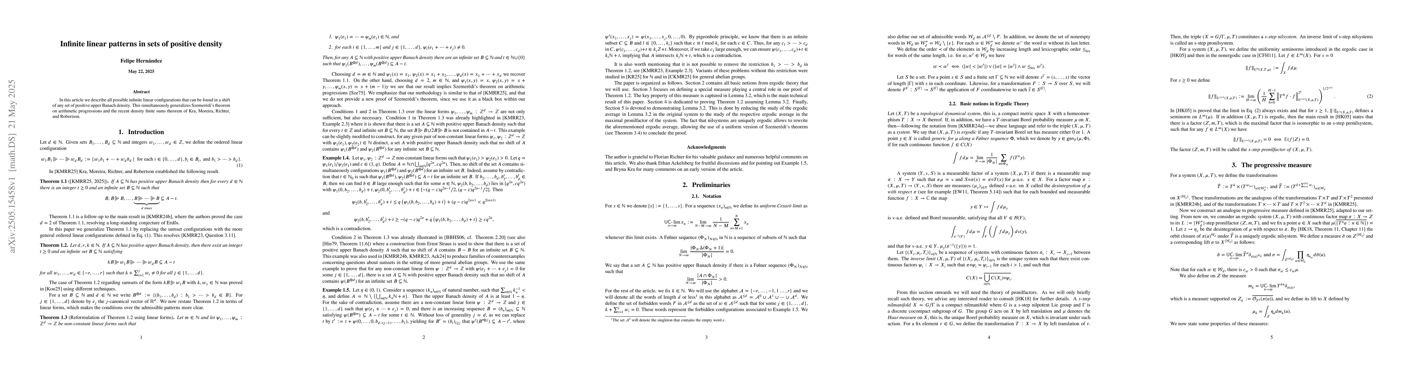 The paper describes infinite linear configurations in shifts of sets with positive upper Banach density, generalizing Szemerédi's theorem and the density finite sums theorem.