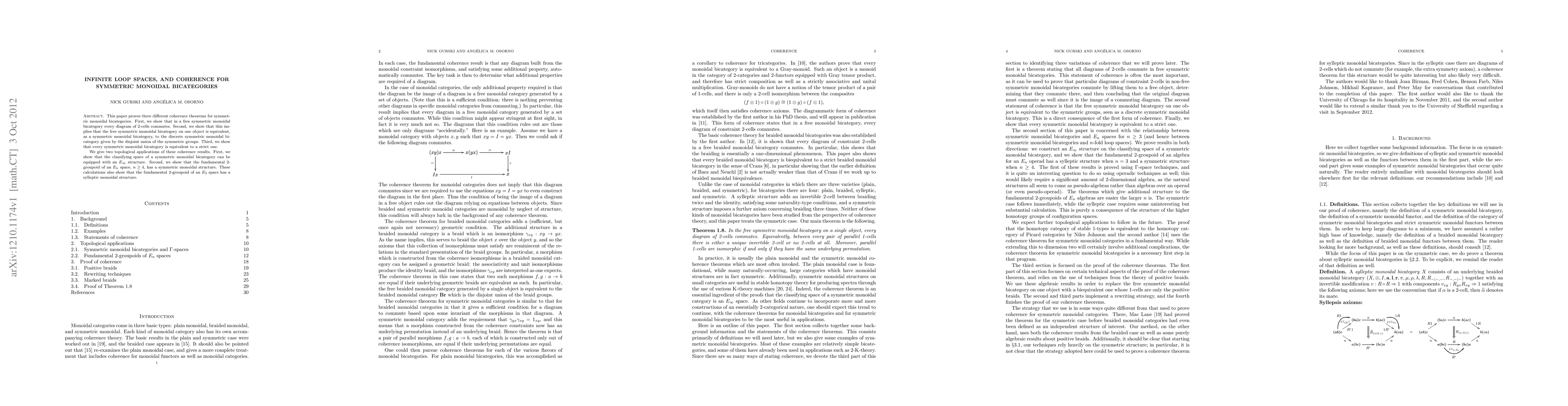 This paper establishes coherence theorems for symmetric monoidal bicategories, proving that free bicategories have commuting 2-cell diagrams, that the free symmetric monoidal bicategory on one object is equivalent to a discrete symmetric monoidal bicategory, and that any symmetric monoidal bicategory is equivalent to a strict one. It also applies these results to topology, showing that classifying spaces of such bicategories can have E_∞ structures and that fundamental 2-groupoids of E_n spaces (n ≥ 4) have symmetric monoidal structures.