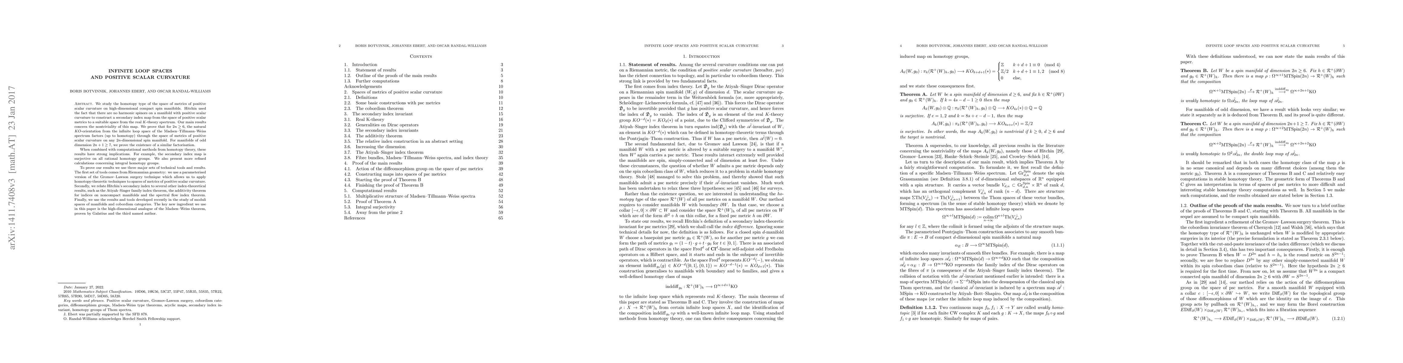 This paper investigates the homotopy type of metrics of positive scalar curvature on high-dimensional spin manifolds, proving that the secondary index map factors through these metrics. It uses advanced tools from Riemannian geometry, index theory, and cobordism to demonstrate the nontriviality of the $KO$-orientation in these spaces.
