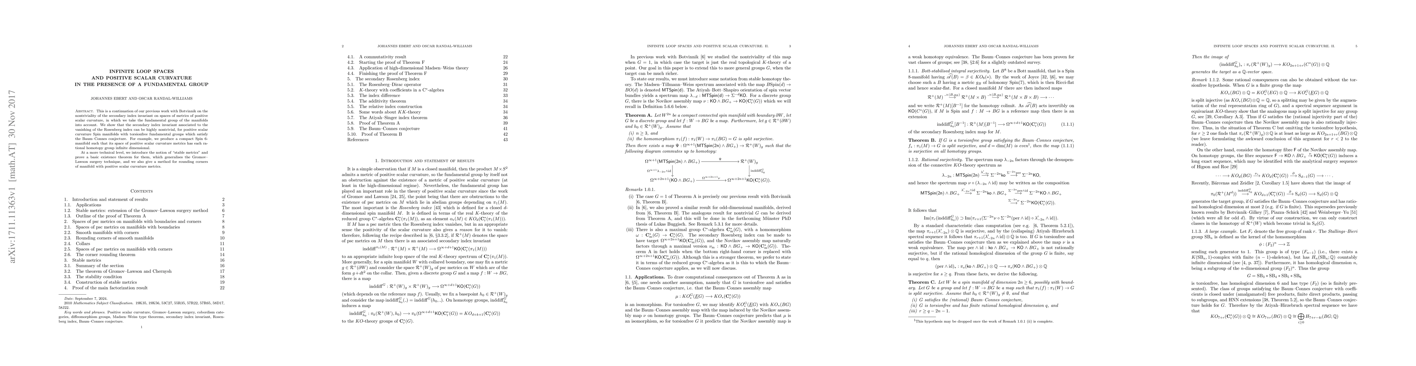 This is a continuation of our previous work with Botvinnik on the nontriviality of the secondary index invariant on spaces of metrics of positive scalar curvature, in which we take the fundamental group of the manifolds into account. We show that the secondary index invariant associated to the vanishing of the Rosenberg index can be highly nontrivial, for positive scalar curvature Spin manifolds with torsionfree fundamental groups which satisfy the Baum--Connes conjecture. For example, we produce a compact Spin 6-manifold such that its space of positive scalar curvature metrics has each rational homotopy group infinite dimensional. At a more technical level, we introduce the notion of "stable metrics" and prove a basic existence theorem for them, which generalises the Gromov--Lawson surgery technique, and we also give a method for rounding corners of manifold with positive scalar curvature metrics.