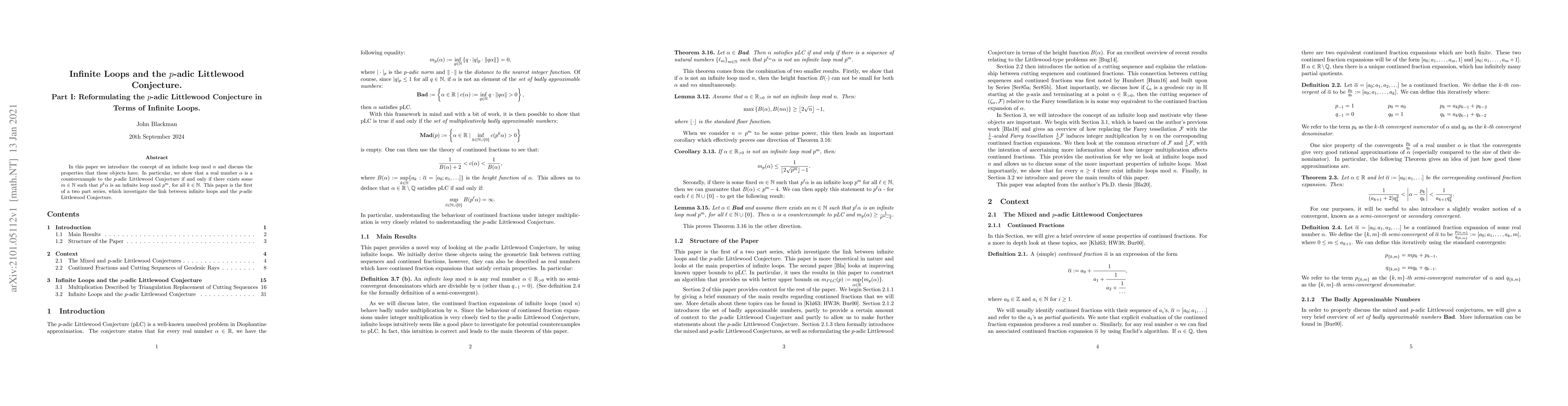This paper introduces infinite loops mod $n$ and demonstrates their properties, particularly linking real number counterexamples to the $p$-adic Littlewood Conjecture with the existence of such infinite loops for $p^k\alpha$ mod $p^m$, establishing a foundational part of a two-part series on this topic.