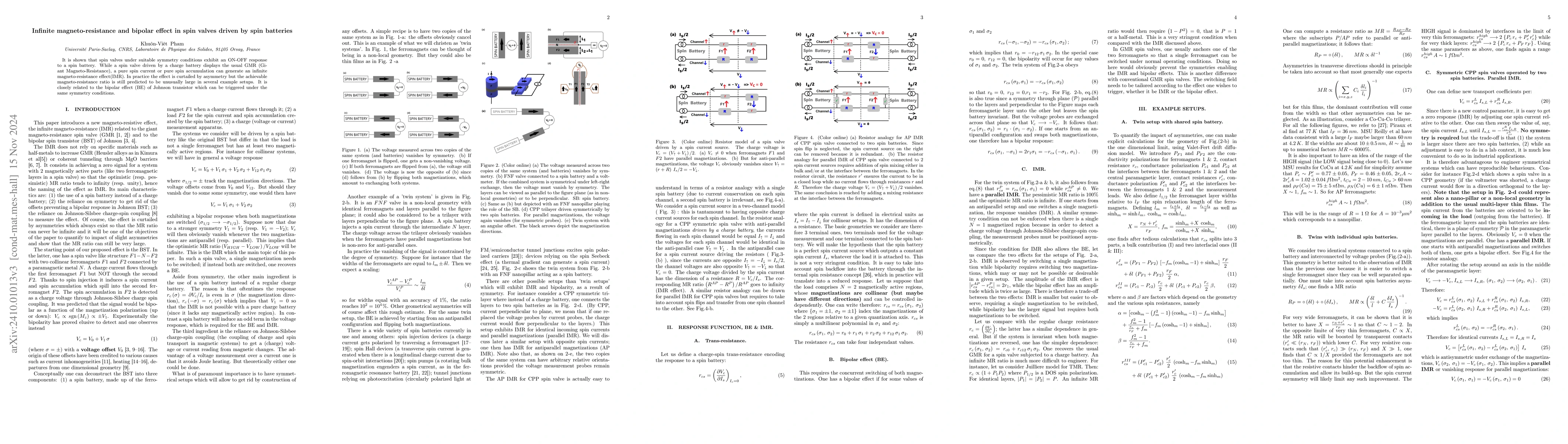 This study reveals that spin valves can display an ON-OFF response when driven by a spin battery, exhibiting infinite magneto-resistance (IMR) and a bipolar effect (BE) under specific symmetry conditions, although practical limitations reduce the effect magnitude. The IMR and BE are notably large in several example configurations.