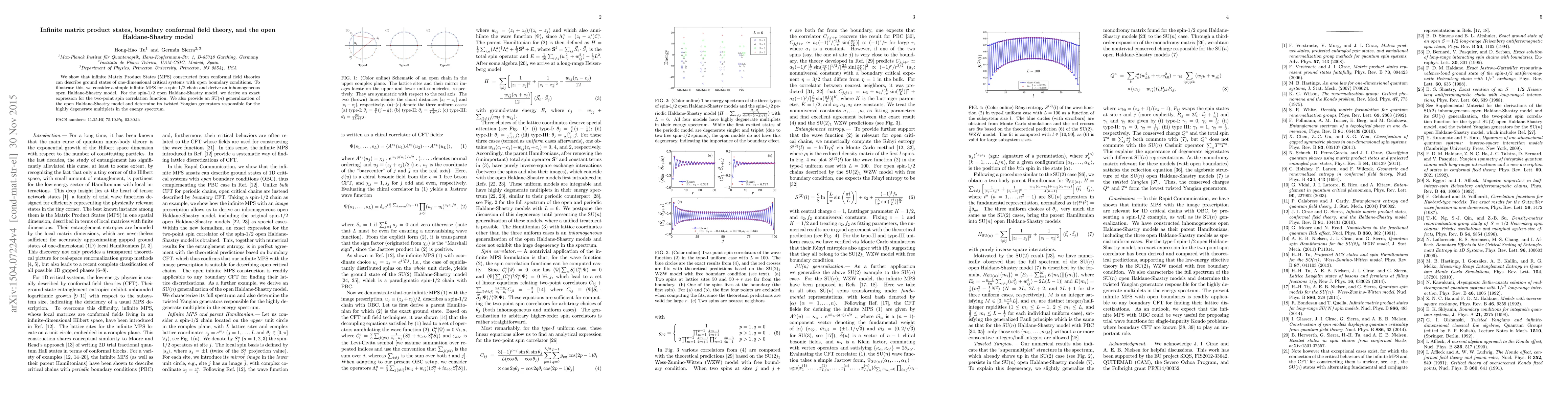 This paper demonstrates that infinite Matrix Product States (MPS) derived from conformal field theories can represent ground states of critical one-dimensional systems with open boundaries. It specifically constructs an infinite MPS for a spin-1/2 chain, deriving an inhomogeneous open Haldane-Shastry model and providing an exact expression for its two-point spin correlation function, along with an SU($n$) generalization and its associated Yangian generators.