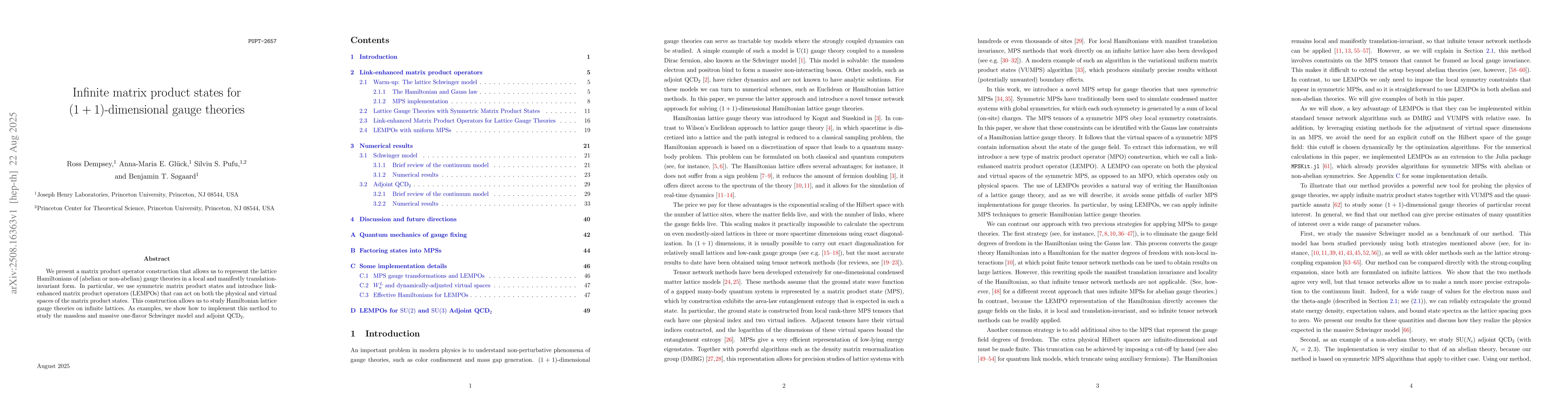 We present a matrix product operator construction that allows us to represent the lattice Hamiltonians of (abelian or non-abelian) gauge theories in a local and manifestly translation-invariant form. In particular, we use symmetric matrix product states and introduce link-enhanced matrix product operators (LEMPOs) that can act on both the physical and virtual spaces of the matrix product states. This construction allows us to study Hamiltonian lattice gauge theories on infinite lattices. As examples, we show how to implement this method to study the massless and massive one-flavor Schwinger model and adjoint QCD$_2$.