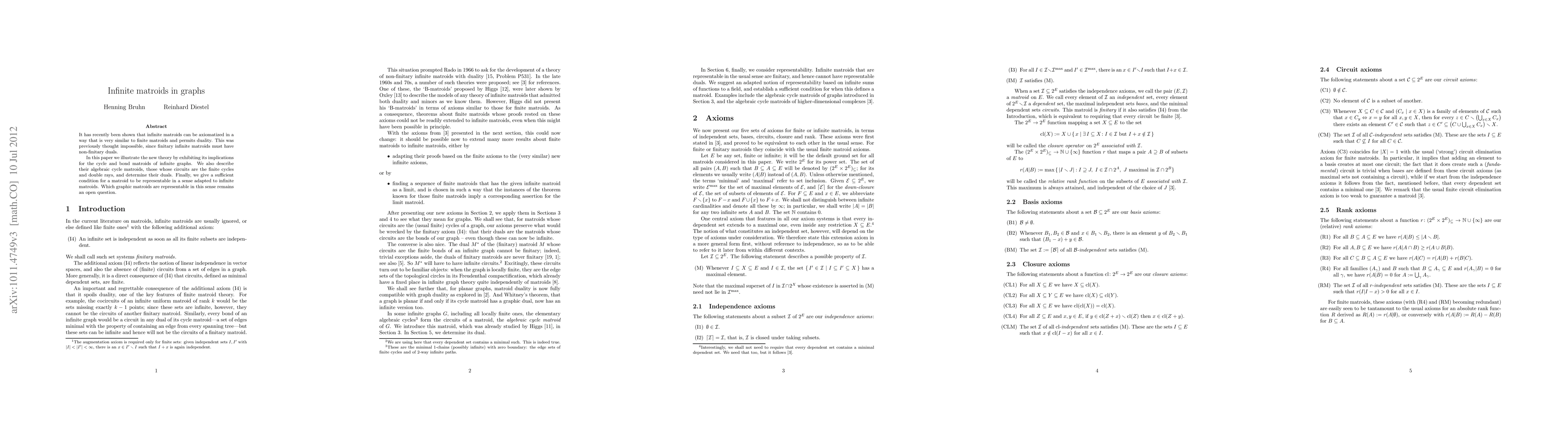 This paper introduces a new theory of infinite matroids similar to finite matroids, demonstrating its application to infinite graph cycle and bond matroids, and determining their duals. It also explores algebraic cycle matroids and provides a condition for representability in the context of infinite matroids, though which graphic matroids meet this condition remains unresolved.