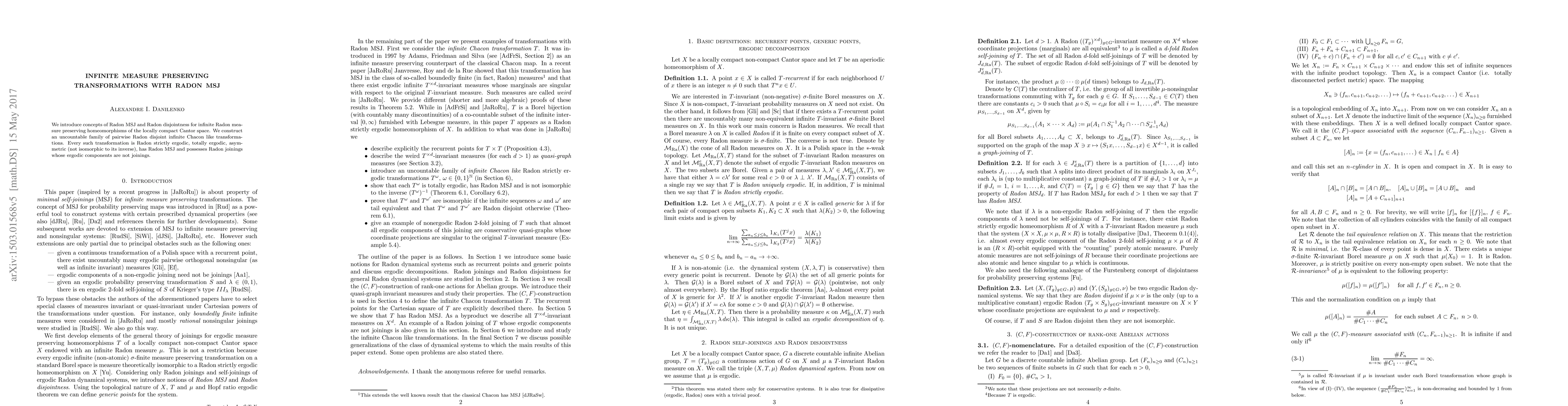 The paper introduces concepts of Radon MSJ and Radon disjointness for infinite Radon measure preserving homeomorphisms of the locally compact Cantor space, constructing an uncountable family of pairwise Radon disjoint infinite Chacon-like transformations.