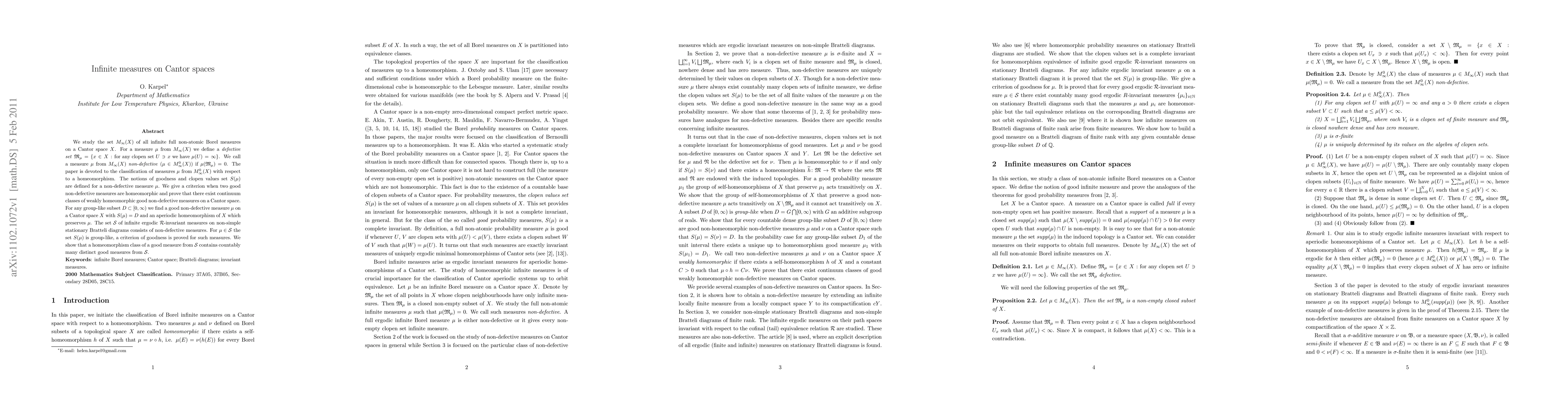 We study the set $M_\infty(X)$ of all infinite full non-atomic Borel measures on a Cantor space X. For a measure $\mu$ from $M_\infty(X)$ we define a defective set $M_\mu = \{x \in X : for any clopen set U which contains x we have \mu(U) = \infty \}$. We call a measure $\mu$ from $M_\infty(X)$ non-defective ($\mu \in M_\infty^0(X)$) if $\mu(M_\mu) = 0$. The paper is devoted to the classification of measures $\mu$ from $M_\infty^0(X)$ with respect to a homeomorphism. The notions of goodness and clopen values set $S(\mu)$ are defined for a non-defective measure $\mu$. We give a criterion when two good non-defective measures are homeomorphic and prove that there exist continuum classes of weakly homeomorphic good non-defective measures on a Cantor space. For any group-like subset $D \subset [0,\infty)$ we find a good non-defective measure $\mu$ on a Cantor space X with $S(\mu) = D$ and an aperiodic homeomorphism of X which preserves $\mu$. The set $S$ of infinite ergodic R-invariant measures on non-simple stationary Bratteli diagrams consists of non-defective measures. For $\mu \in S$ the set $S(\mu)$ is group-like, a criterion of goodness is proved for such measures. We show that a homeomorphism class of a good measure from $S$ contains countably many distinct good measures from $S$.