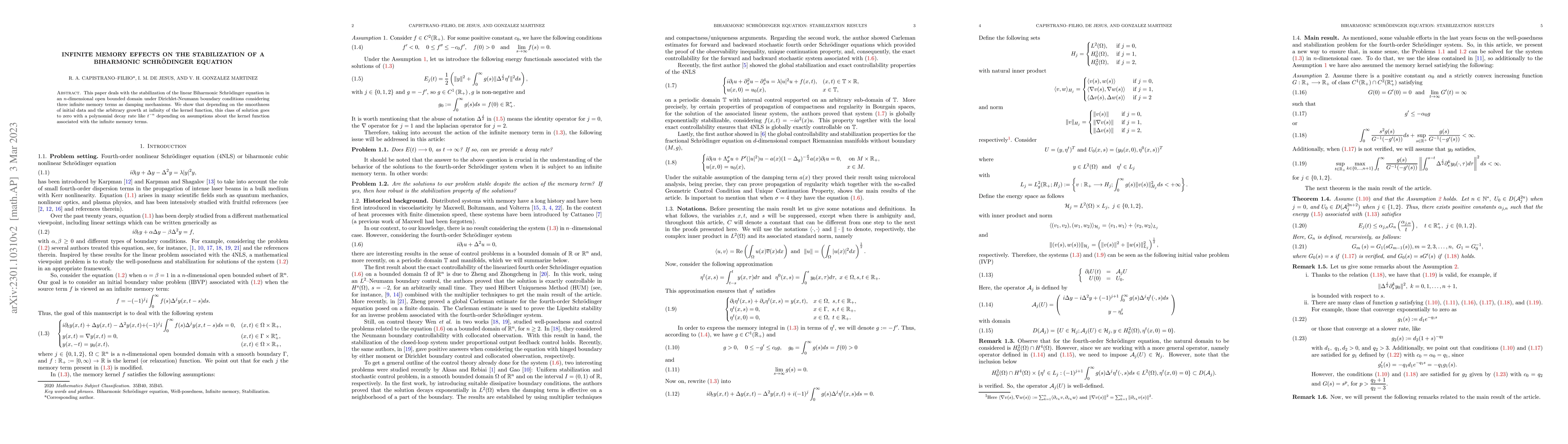This paper deals with the stabilization of the linear Biharmonic Schr\"odinger equation in an $n$-dimensional open bounded domain under Dirichlet-Neumann boundary conditions considering three infinite memory terms as damping mechanisms. We show that depending on the smoothness of initial data and the arbitrary growth at infinity of the kernel function, this class of solution goes to zero with a polynomial decay rate like $t^{-n}$ depending on assumptions about the kernel function associated with the infinite memory terms.
