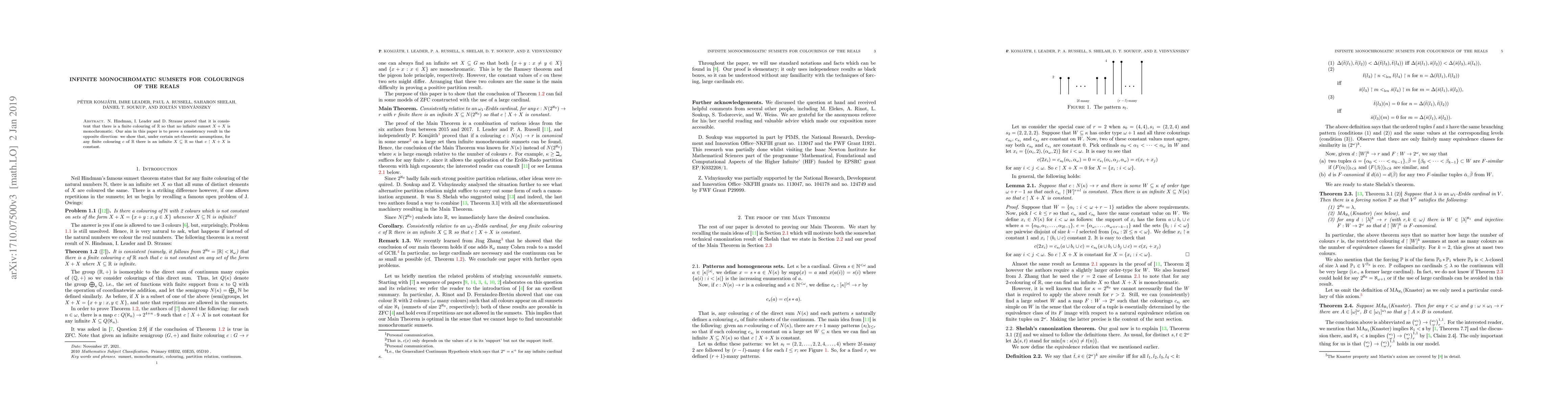 This paper shows that for any finite coloring function of the reals, there exists an infinite set X such that the coloring is constant on X+X. It builds upon a previous result to prove an opposite direction under certain set-theoretic assumptions.