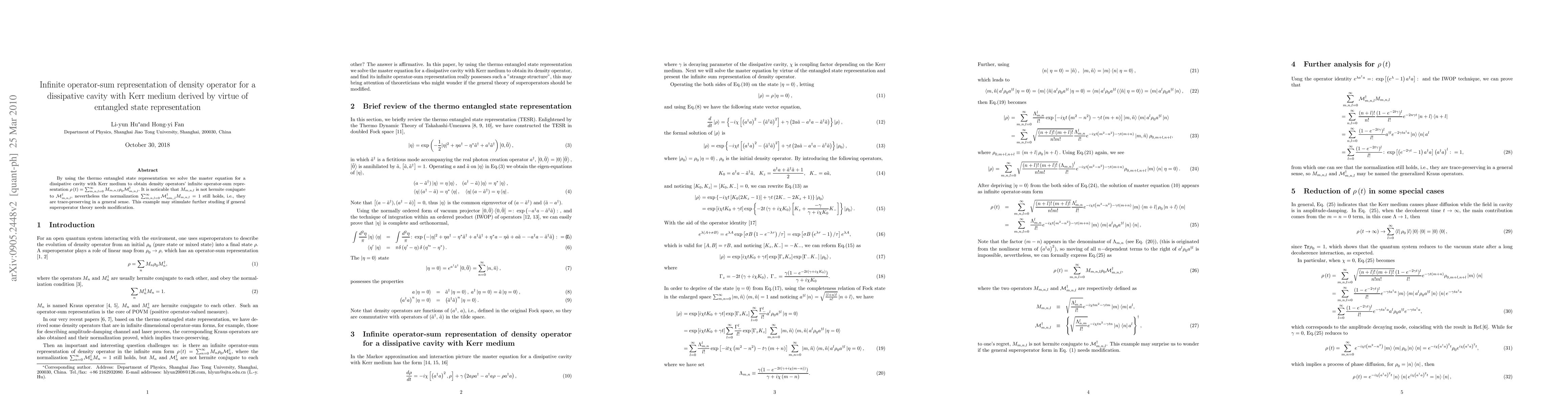 By using the thermo entangled state representation we solve the master equation for a dissipative cavity with Kerr medium to obtain density operators' infinite operator-sum representation}$\rho (t) =\sum_{m,n,l=0}^{\infty}M_{m,n,l}\rho_{0}\mathcal{M}_{m,n,l}^{\dagger}.$ It is noticeable that}$M_{m,n,l}$ is not hermite conjugate to $\mathcal{M}_{m,n,l}^{\dagger}$, nevertheless the normalization}$\sum_{m,n,l=0}^{\infty}\mathcal{M}_{nm,,l}^{\dagger}M_{m,n,l}=1$ still holds}, i.e., they are trace-preserving in a general sense. This example may stimulate further studying if general superoperator theory needs modification.