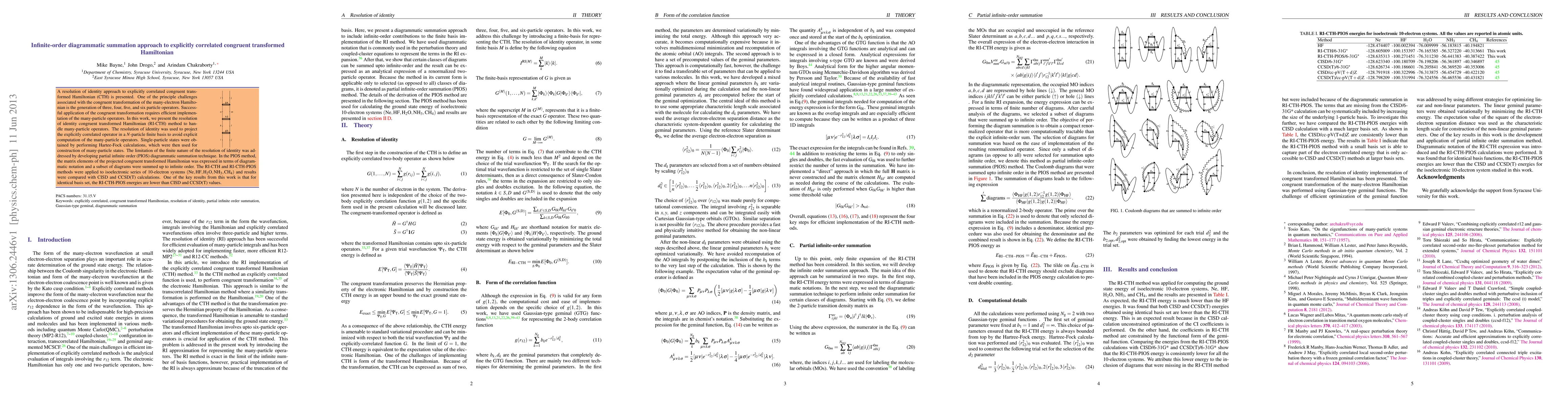 A resolution of identity approach to explicitly correlated congruent transformed Hamiltonian (CTH) is presented. One of the principle challenges associated with the congruent transformation of the many-electron Hamiltonian is the generation of three, four, five, and six particle operators. Successful application of the congruent transformation requires efficient implementation of the many-particle operators. In this work, we present the resolution of identity congruent transformed Hamiltonian (RI-CTH) method to handle many-particle operators. The resolution of identity was used to project the explicitly correlated operator in a N-particle finite basis to avoid explicit computation of the many-particle operators. Single-particle states were obtained by performing Hartee-Fock calculations, which were then used for construction of many-particle states. The limitation of the finite nature of the resolution of identity was addressed by developing partial infinite order (PIOS) diagrammatic summation technique. In the PIOS method, the matrix elements of the projected congruent transformed Hamiltonian was expressed in terms of diagrammatic notation and a subset of diagrams were summed up to infinite order. The RI-CTH and RI-CTH-PIOS methods were applied to isoelectronic series of 10-electron systems (Ne,HF,H2O,NH3,CH4) and results were compared with CISD and CCSD(T) calculations. One of the key results from this work is that for identical basis set, the RI-CTH-PIOS energies are lower than CISD and CCSD(T) values.