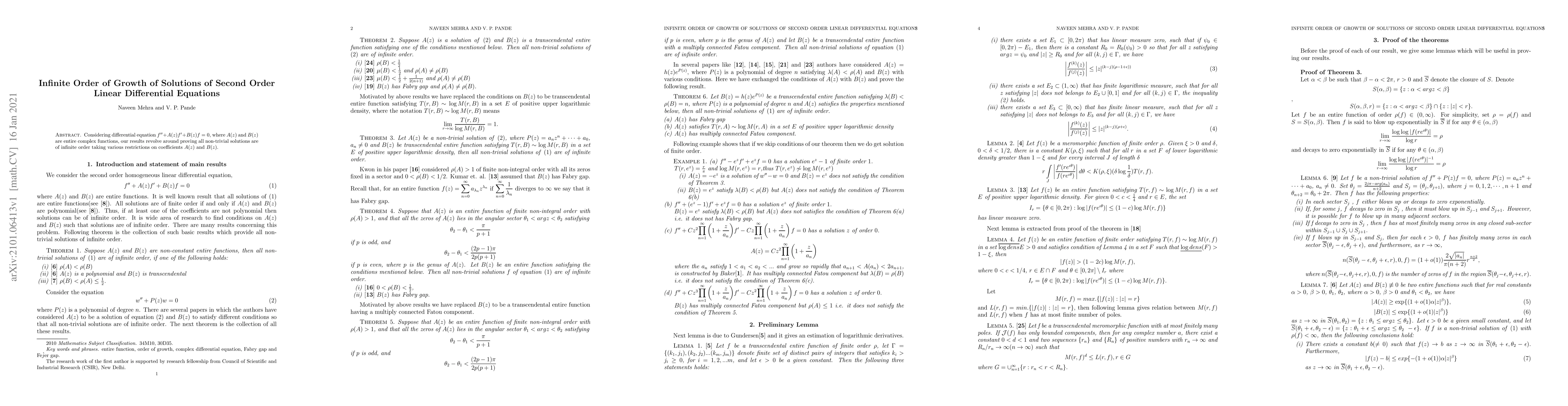 Considering differential equation f''+A(z)f'+B(z)f=0, where A(z) and B(z) are entire complex functions, our results revolve around proving all non-trivial solutions are of infinite order taking various restrictions on coefficients A(z) and B(z).