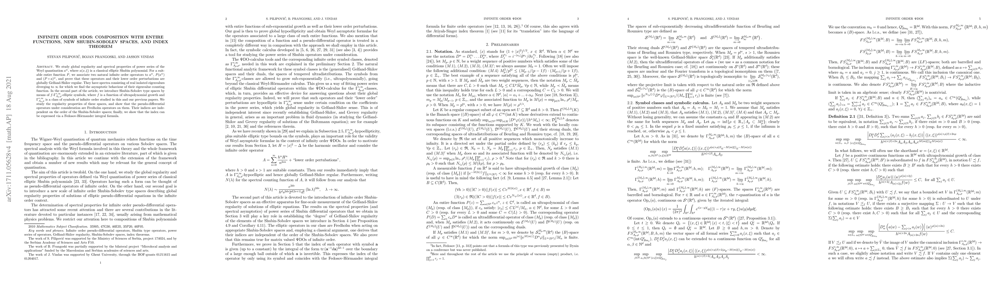 This research explores infinite order pseudodifferential operators (PDOs) associated with elliptic Shubin polynomials, proving their global regularity and spectral properties. It introduces new Shubin-Sobolev spaces using f-Γ*,∞_A_p,ρ-elliptic symbols, demonstrating PDOs' Fredholm regularity on these spaces. The index theorem is established, showing index independence from PDO order and expressible via a Fedosov-Hörmander integral formula.