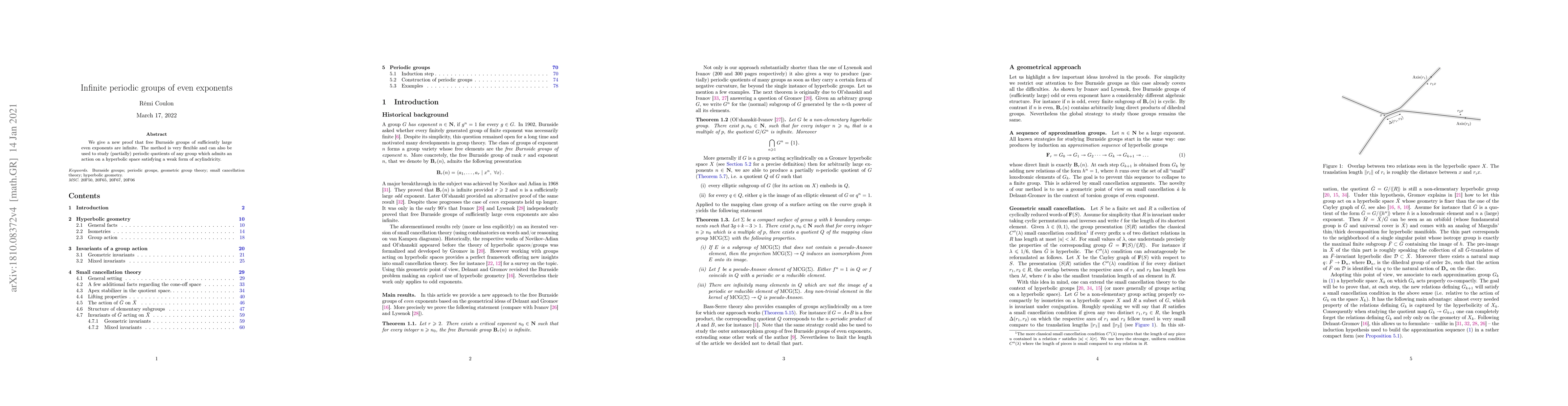 We give a new proof that free Burnside groups of sufficiently large even exponents are infinite. The method is very flexible and can also be used to study (partially) periodic quotients of any group which admits an action on a hyperbolic space satisfying a weak form of acylindricity.
