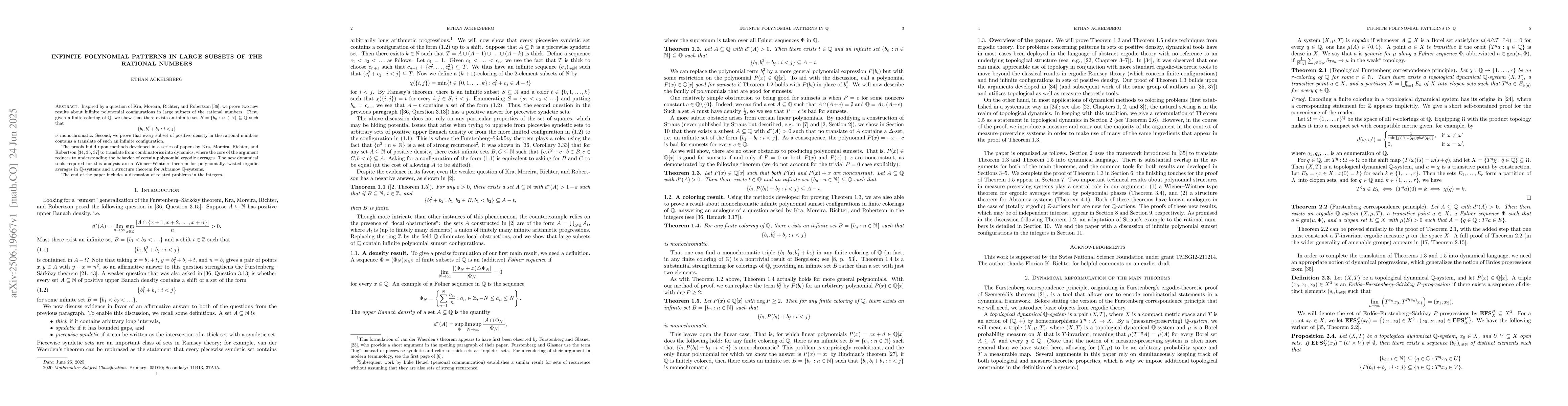 Inspired by a question of Kra, Moreira, Richter, and Robertson, we prove two new results about infinite polynomial configurations in large subsets of the rational numbers. First, given a finite coloring of $\mathbb{Q}$, we show that there exists an infinite set $B = \{b_n : n \in \mathbb{N}\} \subseteq \mathbb{Q}$ such that $\{b_i, b_i^2 + b_j : i < j\}$ is monochromatic. Second, we prove that every subset of positive density in the rational numbers contains a translate of such an infinite configuration. The proofs build upon methods developed in a series of papers by Kra, Moreira, Richter, and Robertson to translate from combinatorics into dynamics, where the core of the argument reduces to understanding the behavior of certain polynomial ergodic averages. The new dynamical tools required for this analysis are a Wiener--Wintner theorem for polynomially-twisted ergodic averages in $\mathbb{Q}$-systems and a structure theorem for Abramov $\mathbb{Q}$-systems. The end of the paper includes a discussion of related problems in the integers.