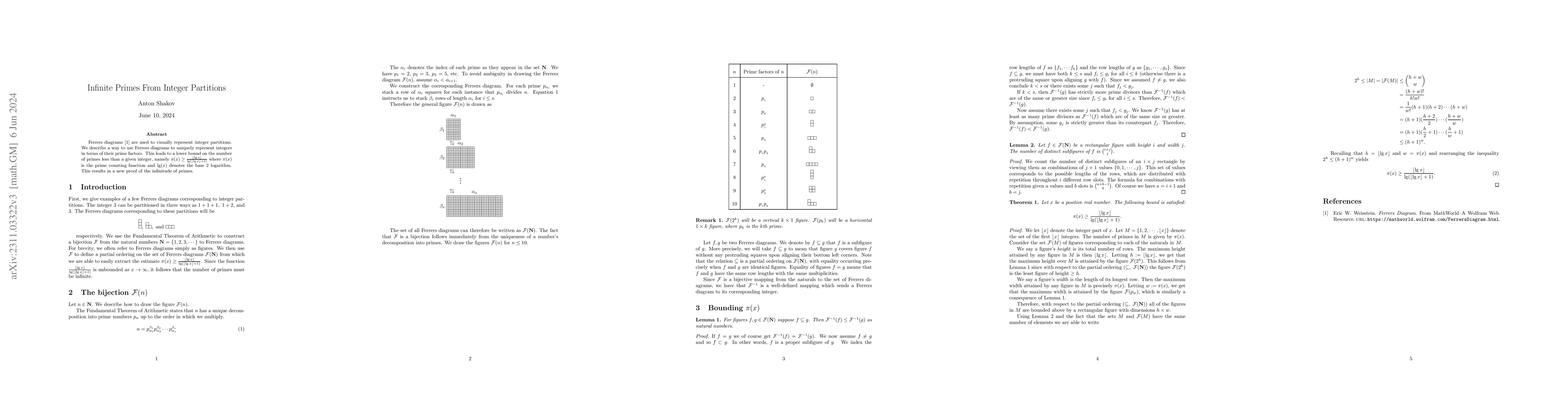 This paper introduces a method using Ferrers diagrams to represent integers based on their prime factors, leading to a novel lower bound for the prime counting function and a new proof of the infinitude of primes.