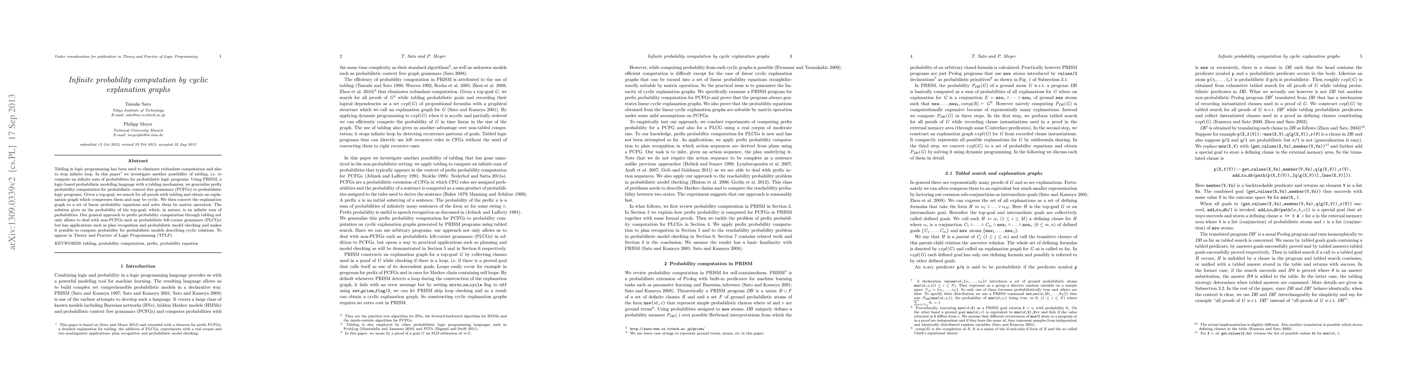 Tabling in logic programming has been used to eliminate redundant computation and also to stop infinite loop. In this paper we investigate another possibility of tabling, i.e. to compute an infinite sum of probabilities for probabilistic logic programs. Using PRISM, a logic-based probabilistic modeling language with a tabling mechanism, we generalize prefix probability computation for probabilistic context free grammars (PCFGs) to probabilistic logic programs. Given a top-goal, we search for all proofs with tabling and obtain an explanation graph which compresses them and may be cyclic. We then convert the explanation graph to a set of linear probability equations and solve them by matrix operation. The solution gives us the probability of the top-goal, which, in nature, is an infinite sum of probabilities. Our general approach to prefix probability computation through tabling not only allows to deal with non-PCFGs such as probabilistic left-corner grammars (PLCGs) but has applications such as plan recognition and probabilistic model checking and makes it possible to compute probability for probabilistic models describing cyclic relations. To appear in Theory and Practice of Logic Programming (TPLP).