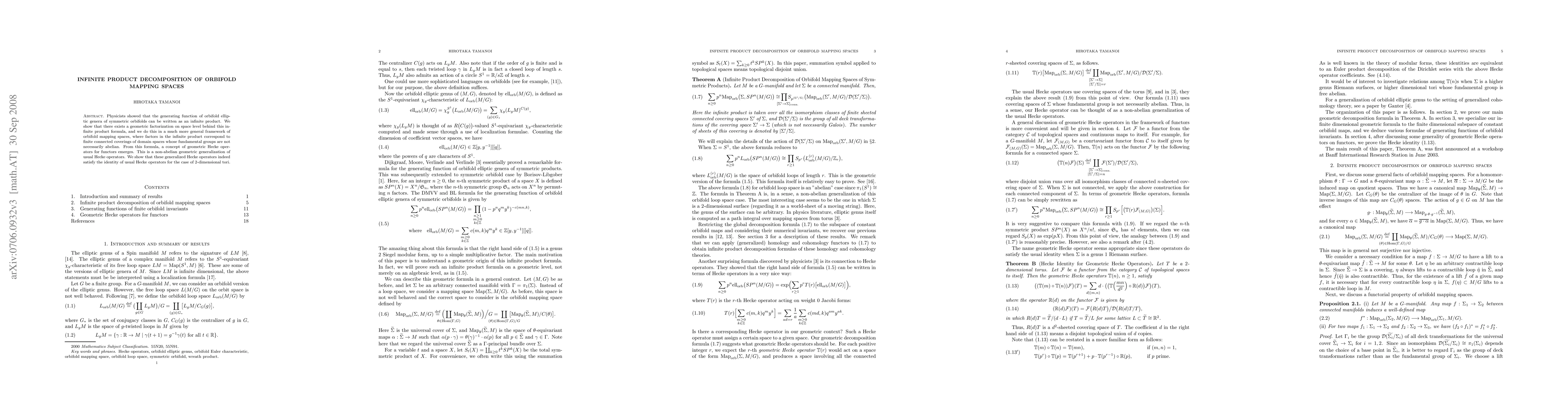 Physicists showed that the generating function of orbifold elliptic genera of symmetric orbifolds can be written as an infinite product. We show that there exists a geometric factorization on space level behind this infinite product formula in much more general framework, where factors in the infinite product correspond to isomorphism classes of connected finite covering spaces of manifolds involved. From this formula, a concept of geometric Hecke operators for functors emerges. We show that these Hecke operators indeed satisfy the usual identity of Hecke operators for the case of 2-dimensional tori.