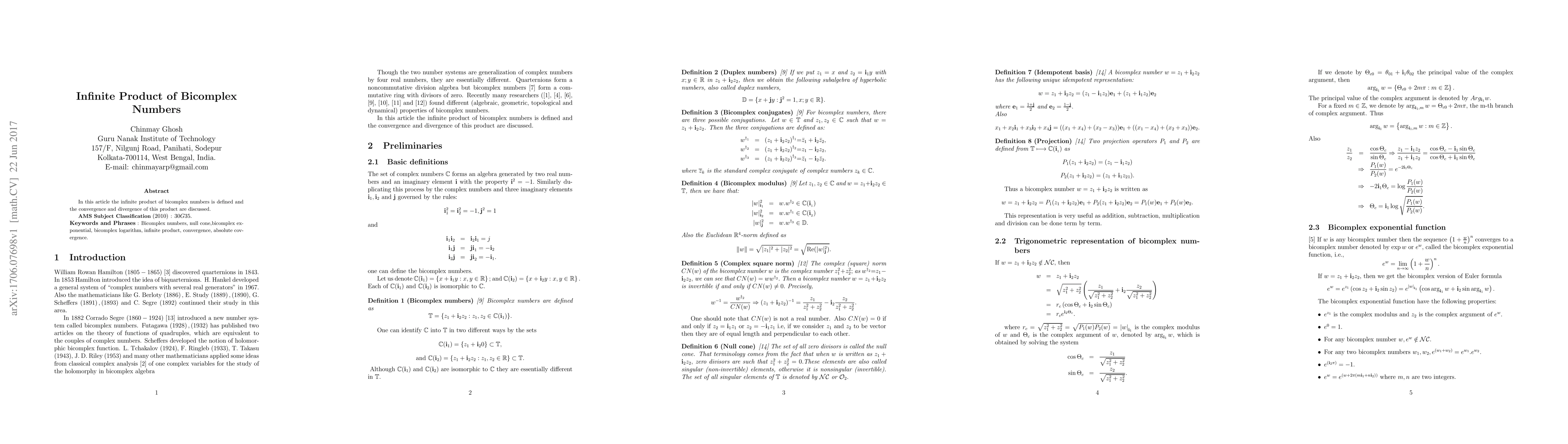 Summary: This paper defines the infinite product of bicomplex numbers and explores its convergence and divergence properties, providing insights into the behavior of such products in the bicomplex number system.