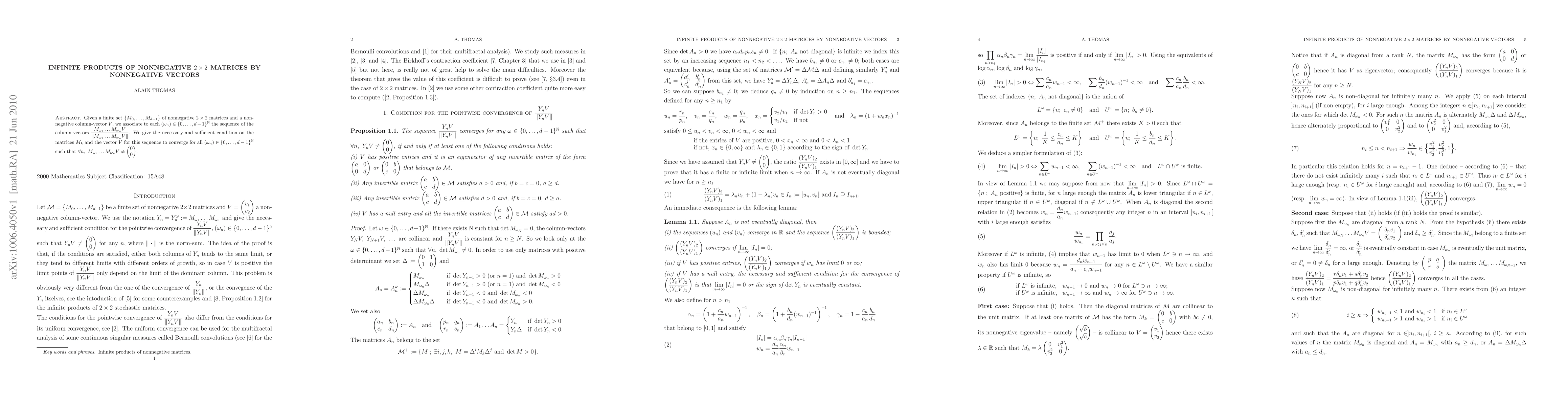 Given a finite set $\{M_0,\dots,M_{d-1}\}$ of nonnegative $2\times 2$ matrices and a nonnegative column-vector $V$, we associate to each $(\omega_n)\in\{0,\dots,d-1\}^\mathbb N$ the sequence of the column-vectors $\displaystyle{M_{\omega_1}\dots M_{\omega_n}V\over\Vert M_{\omega_1}\dots M_{\omega_n}V\Vert}$. We give the necessary and sufficient condition on the matrices $M_k$ and the vector $V$ for this sequence to converge for all \hbox{$(\omega_n)\in\{0,\dots,d-1\}^\mathbb N$} such that $\forall n,\ M_{\omega_1}\dots M_{\omega_n}V\ne\begin{pmatrix}0\\0\end{pmatrix}$.