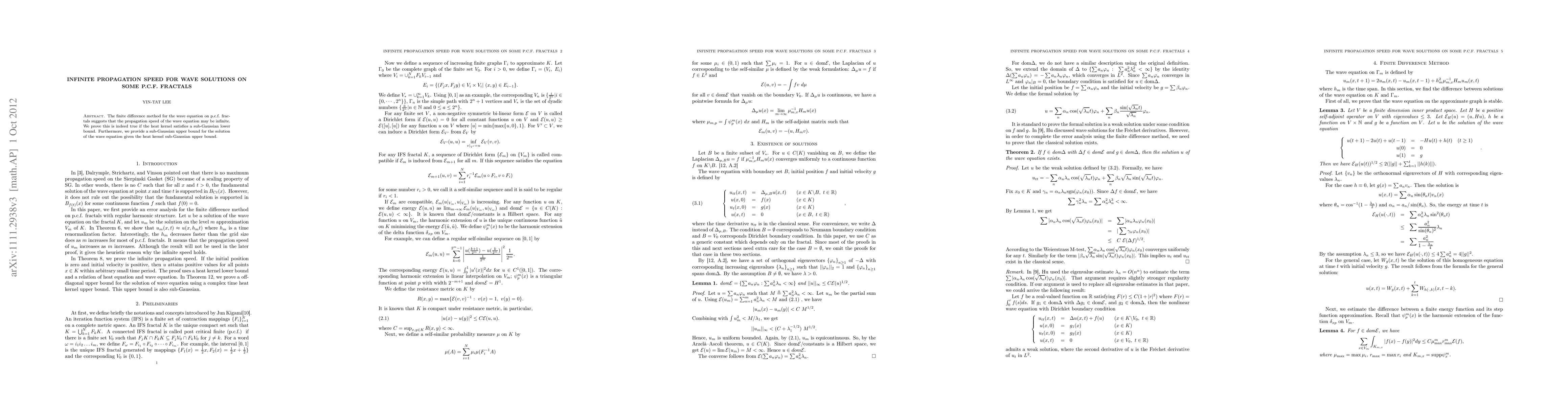 This paper proves that wave solutions on a large class of p.c.f. fractals exhibit infinite propagation speed, contingent on the heat kernel satisfying a sub-Gaussian lower bound. It also establishes a sub-Gaussian upper bound for the wave kernel based on the heat kernel's upper bound.
