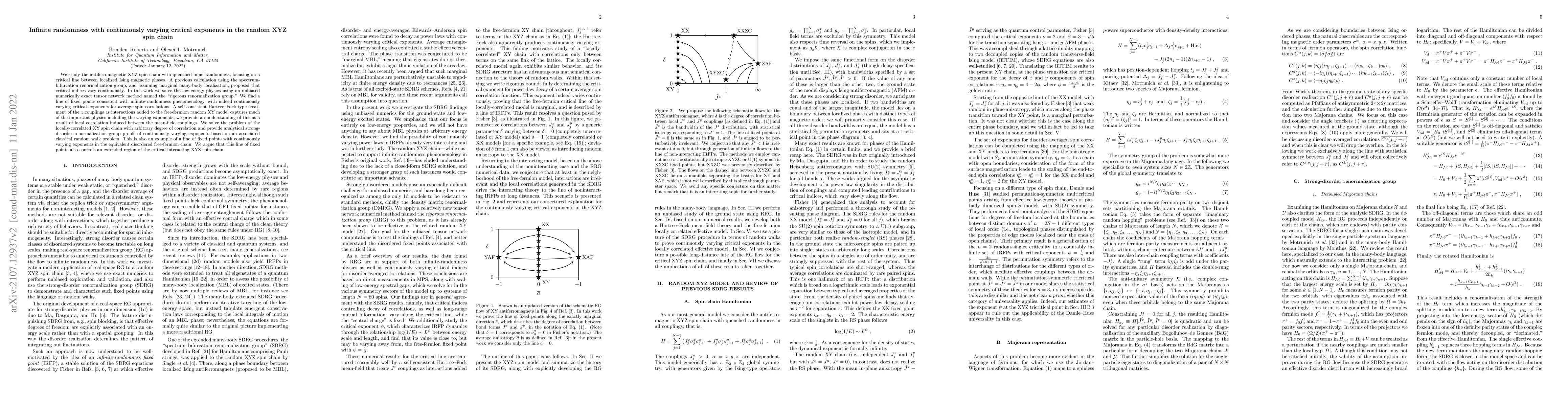 This paper investigates the antiferromagnetic XYZ spin chain with bond randomness, revealing a critical line between localized phases with continuously varying critical exponents. Using a numerically exact tensor network method, the authors find support for infinite-randomness phenomenology and provide analytical proofs for the continuously varying exponents through a self-consistent Hartree-Fock treatment.