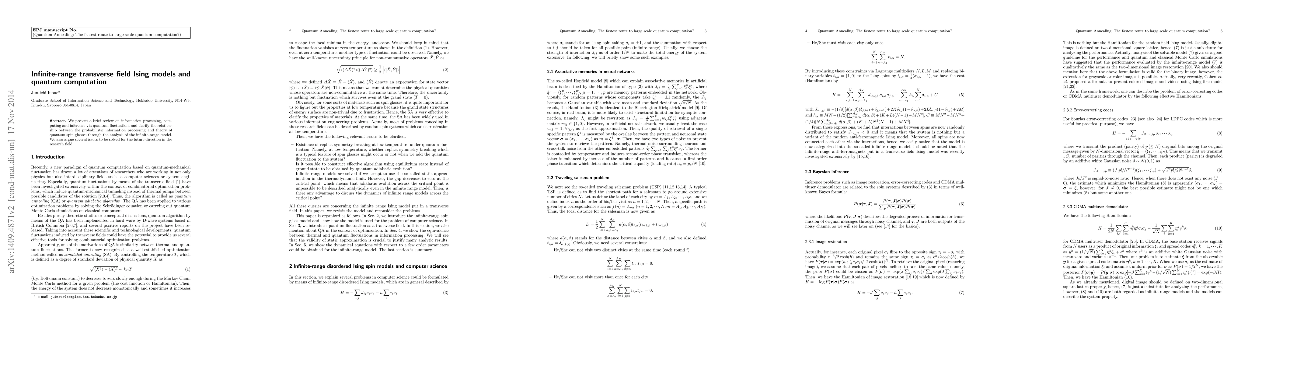 Researchers review the connection between infinite-range transverse field Ising models and quantum computation, exploring its potential for information processing and inference via quantum fluctuations.
