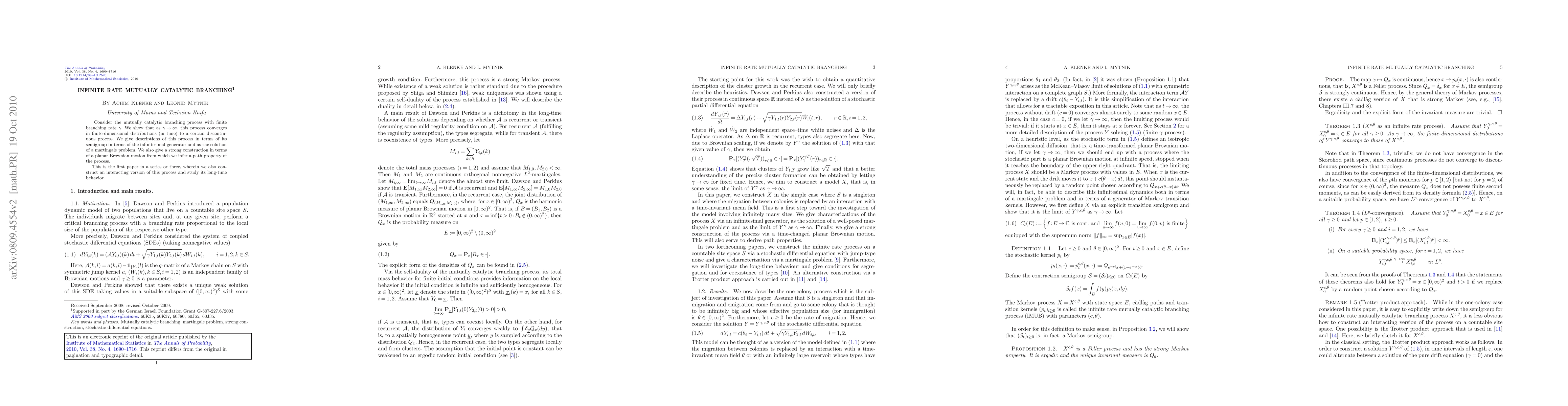 Consider the mutually catalytic branching process with finite branching rate $\gamma$. We show that as $\gamma\to\infty$, this process converges in finite-dimensional distributions (in time) to a certain discontinuous process. We give descriptions of this process in terms of its semigroup in terms of the infinitesimal generator and as the solution of a martingale problem. We also give a strong construction in terms of a planar Brownian motion from which we infer a path property of the process. This is the first paper in a series or three, wherein we also construct an interacting version of this process and study its long-time behavior.