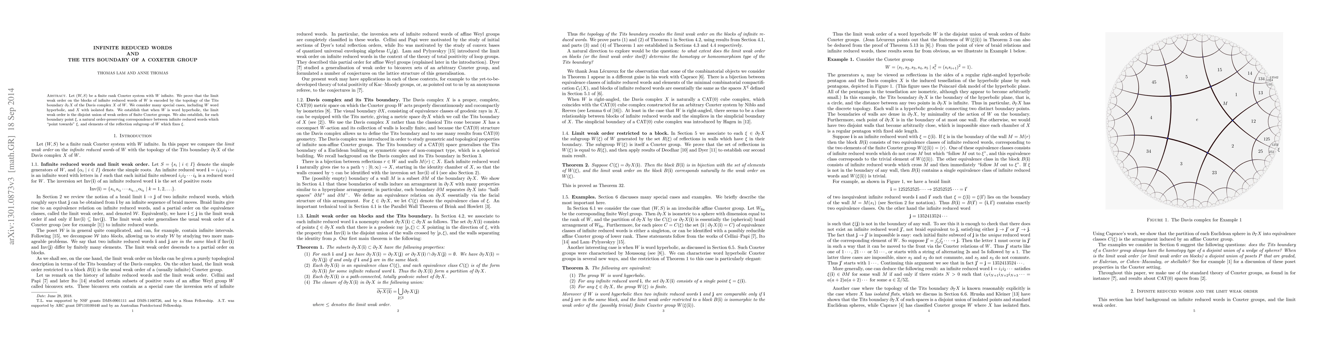 Let (W,S) be a finite rank Coxeter system with W infinite. We prove that the limit weak order on the blocks of infinite reduced words of W is encoded by the topology of the Tits boundary of the Davis complex X of W. We consider many special cases, including W word hyperbolic, and X with isolated flats. We establish that when W is word hyperbolic, the limit weak order is the disjoint union of weak orders of finite Coxeter groups. We also establish, for each boundary point \xi, a natural order-preserving correspondence between infinite reduced words which "point towards" \xi, and elements of the reflection subgroup of W which fixes \xi.