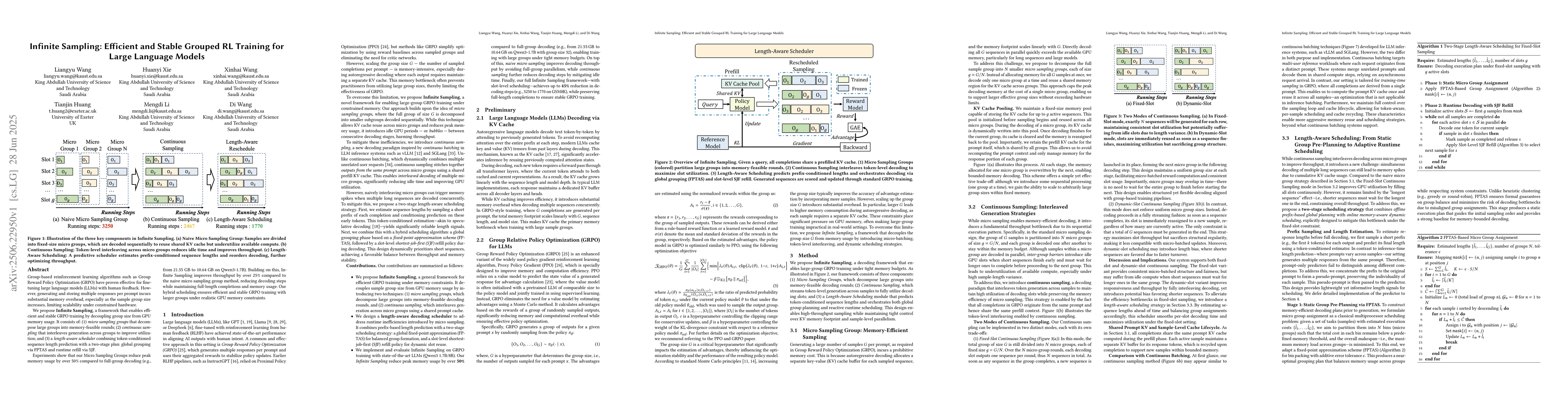 The research introduces Infinite Sampling, a method to efficiently train large language models with human feedback using Group Reward Policy Optimization (GRPO). It achieves this by breaking down large sampling groups into manageable micro groups, interleaving generation across groups, and employing a length-aware scheduler. This results in over 50% reduction in peak memory usage and more than 25% improvement in throughput, enabling stable and scalable GRPO training under GPU memory constraints.