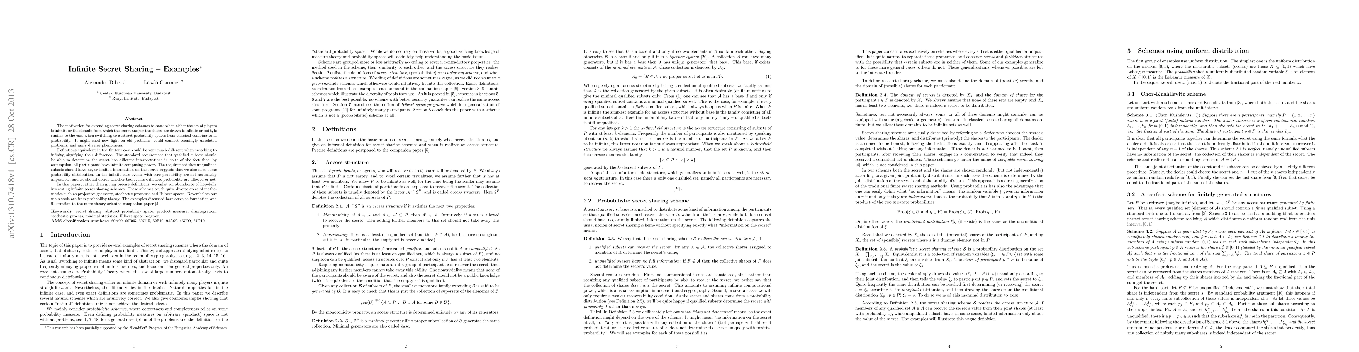The motivation for extending secret sharing schemes to cases when either the set of players is infinite or the domain from which the secret and/or the shares are drawn is infinite or both, is similar to the case when switching to abstract probability spaces from classical combinatorial probability. It might shed new light on old problems, could connect seemingly unrelated problems, and unify diverse phenomena. Definitions equivalent in the finitary case could be very much different when switching to infinity, signifying their difference. The standard requirement that qualified subsets should be able to determine the secret has different interpretations in spite of the fact that, by assumption, all participants have infinite computing power. The requirement that unqualified subsets should have no, or limited information on the secret suggests that we also need some probability distribution. In the infinite case events with zero probability are not necessarily impossible, and we should decide whether bad events with zero probability are allowed or not. In this paper, rather than giving precise definitions, we enlist an abundance of hopefully interesting infinite secret sharing schemes. These schemes touch quite diverse areas of mathematics such as projective geometry, stochastic processes and Hilbert spaces. Nevertheless our main tools are from probability theory. The examples discussed here serve as foundation and illustration to the more theory oriented companion paper.