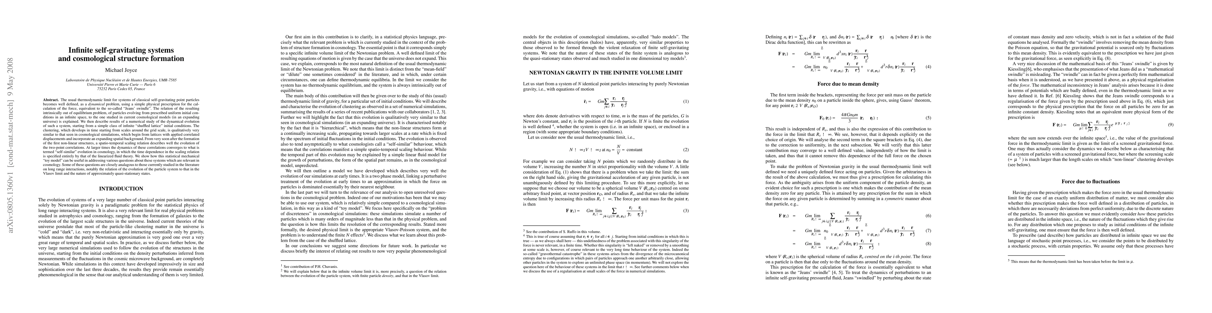 The usual thermodynamic limit for systems of classical self-gravitating point particles becomes well defined, as a {\it dynamical} problem, using a simple physical prescription for the calculation of the force, equivalent to the so-called ``Jeans' swindle''. The relation of the resulting intrinsically out of equilibrium problem, of particles evolving from prescribed uniform initial conditions in an infinite space, to the one studied in current cosmological models (in an expanding universe) is explained. We then describe results of a numerical study of the dynamical evolution of such a system, starting from a simple class of infinite ``shuffled lattice'' initial conditions. The clustering, which develops in time starting from scales around the grid scale, is qualitatively very similar to that seen in cosmological simulations, which begin from lattices with applied correlated displacements and incorporate an expanding spatial background. From very soon after the formation of the first non-linear structures, a spatio-temporal scaling relation describes well the evolution of the two-point correlations. At larger times the dynamics of these correlations converges to what is termed ``self-similar'' evolution in cosmology, in which the time dependence in the scaling relation is specified entirely by that of the linearized fluid theory. We show how this statistical mechanical ``toy model'' can be useful in addressing various questions about these systems which are relevant in cosmology. Some of these questions are closely analagous to those currently studied in the literature on long range interactions, notably the relation of the evolution of the particle system to that in the Vlasov limit and the nature of approximately quasi-stationary states.