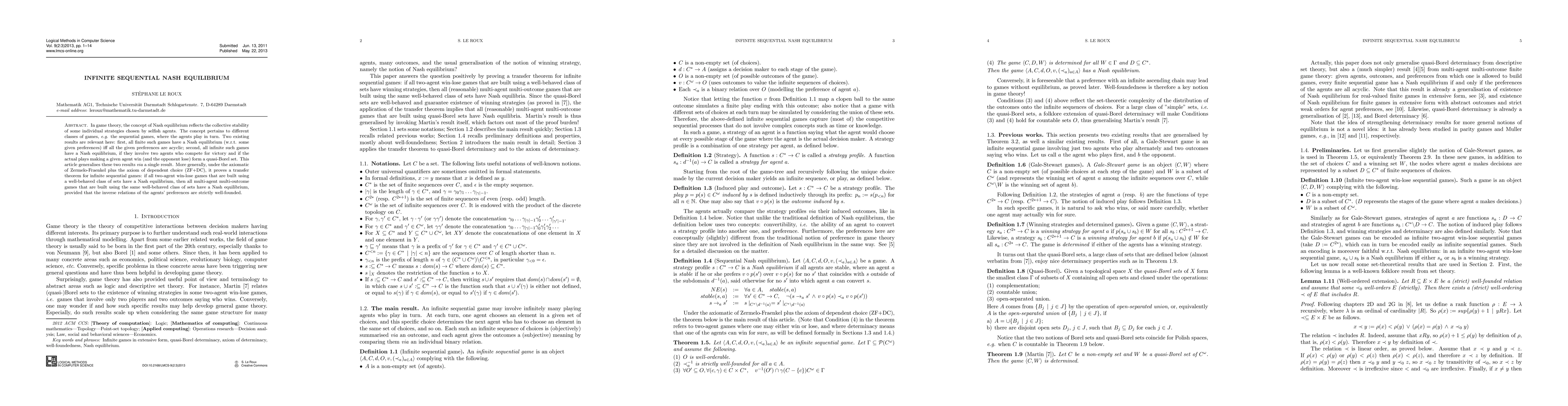 The paper presents a transfer theorem for infinite sequential games, linking determinacy in two-agent win-lose games to the existence of Nash equilibria in multi-agent, multi-outcome games under well-founded preference relations.