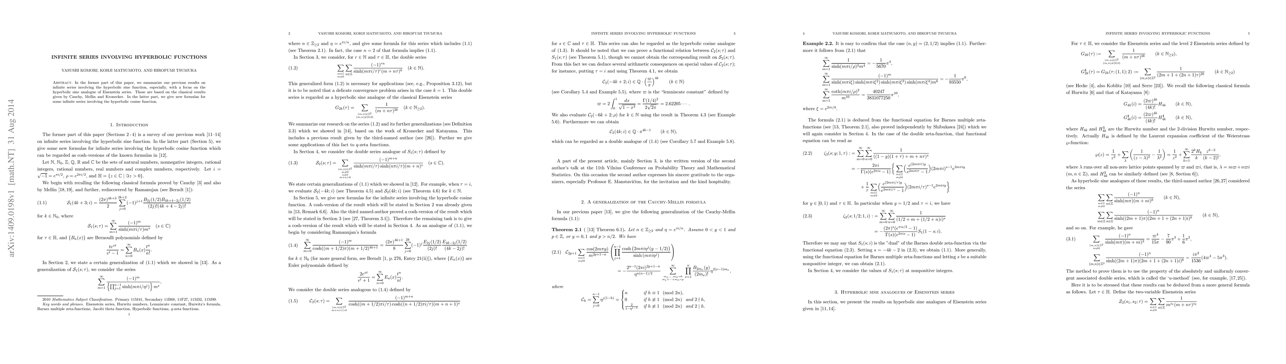 Summary: This paper reviews previous findings on infinite series related to the hyperbolic sine function, particularly the hyperbolic sine analogue of Eisenstein series, and introduces new formulas for infinite series involving the hyperbolic cosine function.