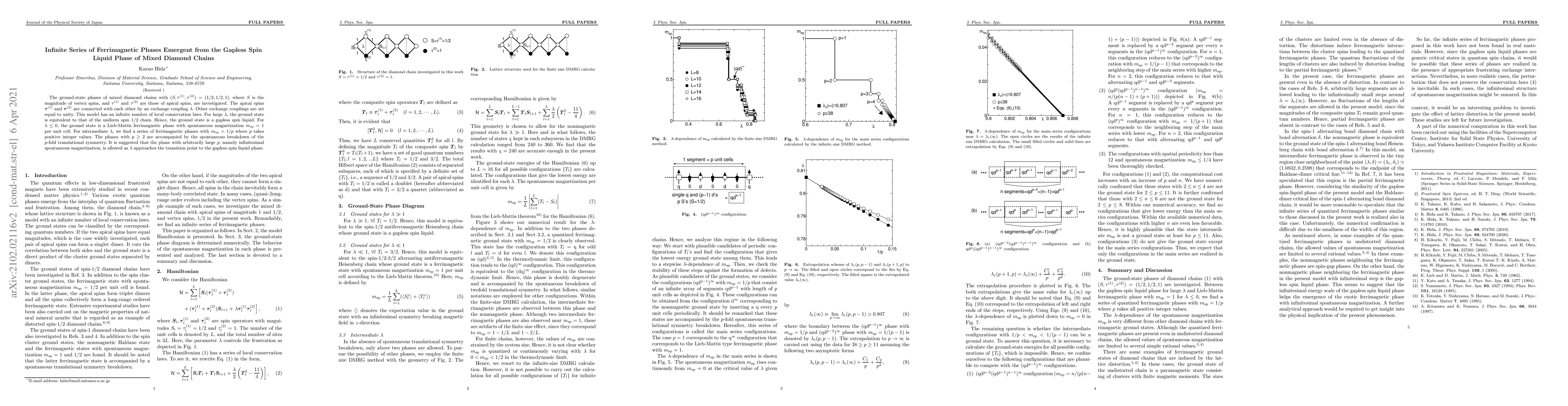 This paper investigates the ground-state phases of mixed diamond chains, revealing an infinite series of ferrimagnetic phases emerging from a gapless spin liquid phase. For large exchange coupling, the system behaves like a uniform spin $1/2$ chain, while for intermediate couplings, it exhibits ferrimagnetic phases with spontaneous magnetization.