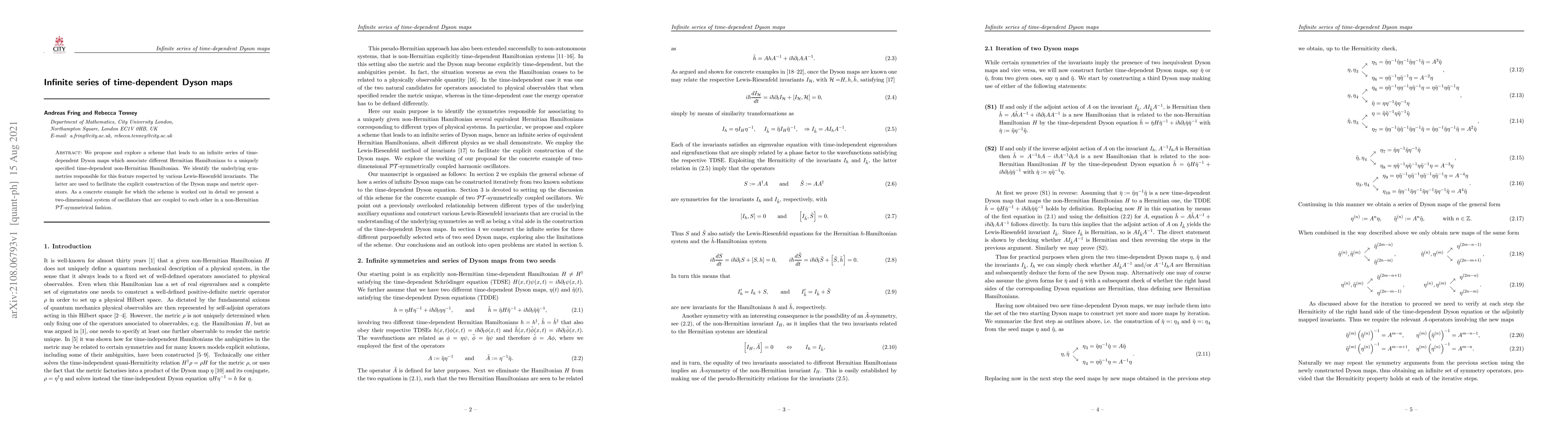 We propose and explore a scheme that leads to an infinite series of time- dependent Dyson maps which associate different Hermitian Hamiltonians to a uniquely specified time-dependent non-Hermitian Hamiltonian. We identify the underlying sym- metries responsible for this feature respected by various Lewis-Riesenfeld invariants. The latter are used to facilitate the explicit construction of the Dyson maps and metric oper- ators. As a concrete example for which the scheme is worked out in detail we present a two-dimensional system of oscillators that are coupled to each other in a non-Hermitian PT -symmetrical fashion